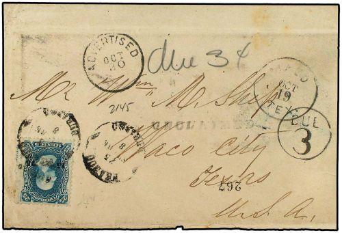 1875 Cover used to TEXAS bearing 25 c. tied by black cds, showing the US ´DUE 3´ hs with the sl ´UNCLAIMED´, circular ´ADVERTISED´ & the DEAD LETTER OFFICE ds on the reverse.
