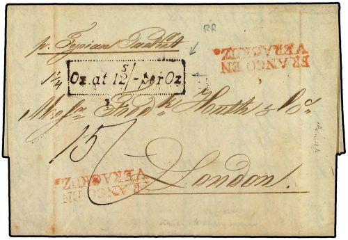 1831 (Feb 24) Entire letter to London with two strikes of red despatch ´FRANCO EN-VERA CRUZ´ handstamps in red, reverse with unusual ´6´ in red; carried on the ´Tyrian Packet´ and charged on arrival with superb strike of ´Oz at 12/s per oz´ at 1¼oz and charged 15 shillings due on arrival. London FPO cds on reverse dated April 27th. A fine and rare entire.