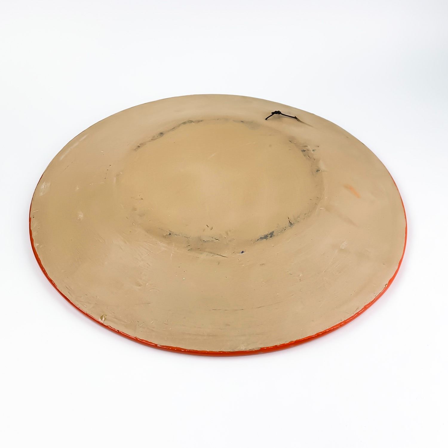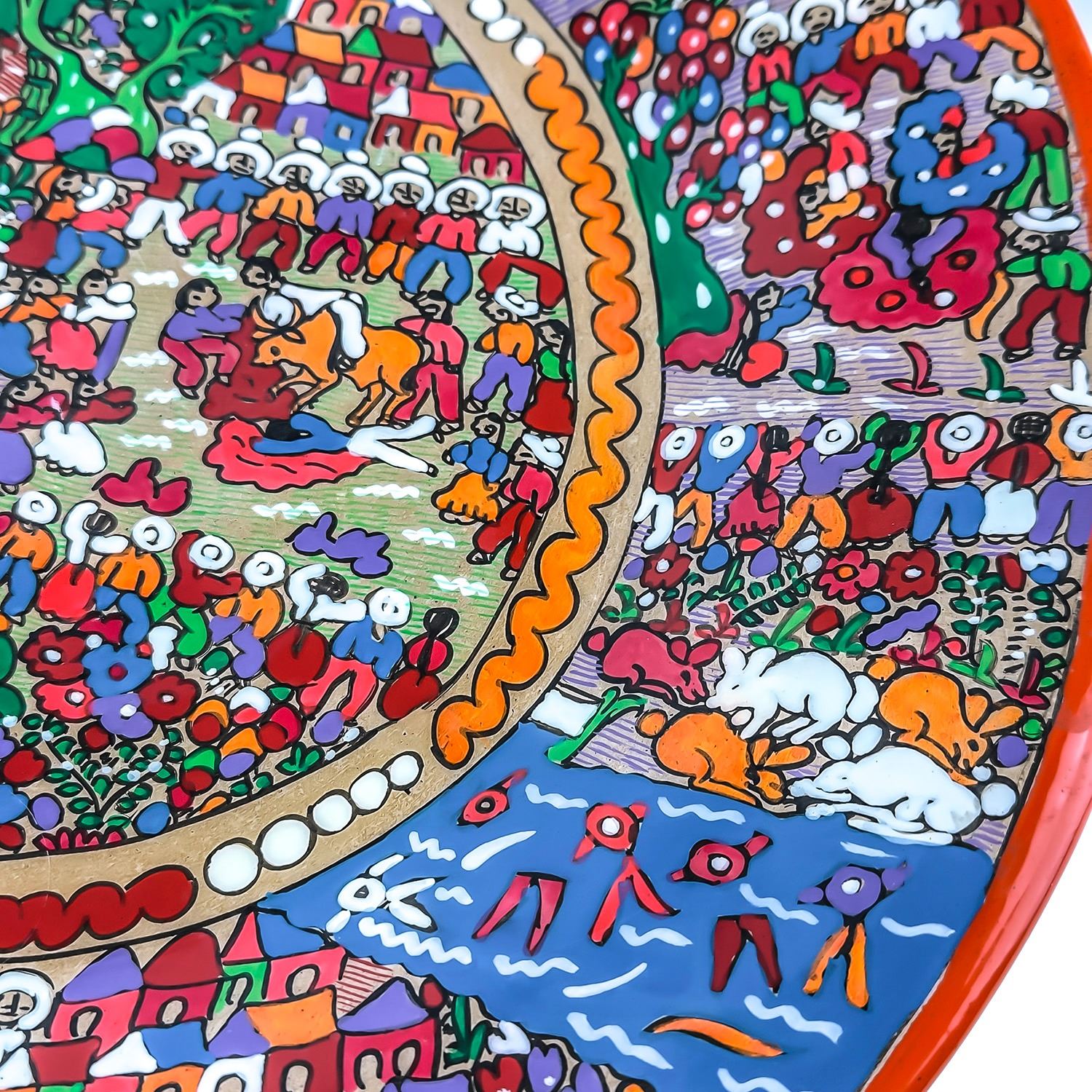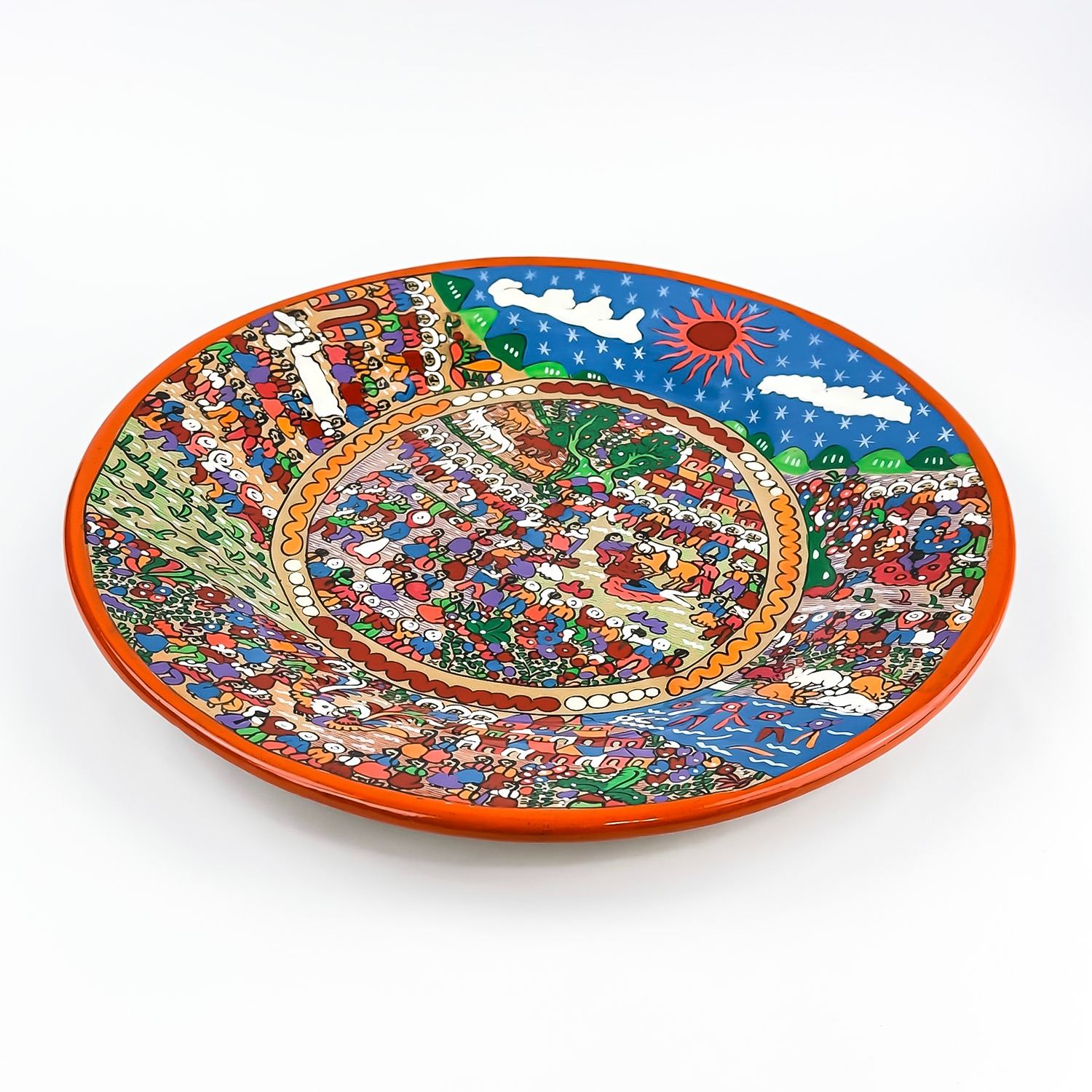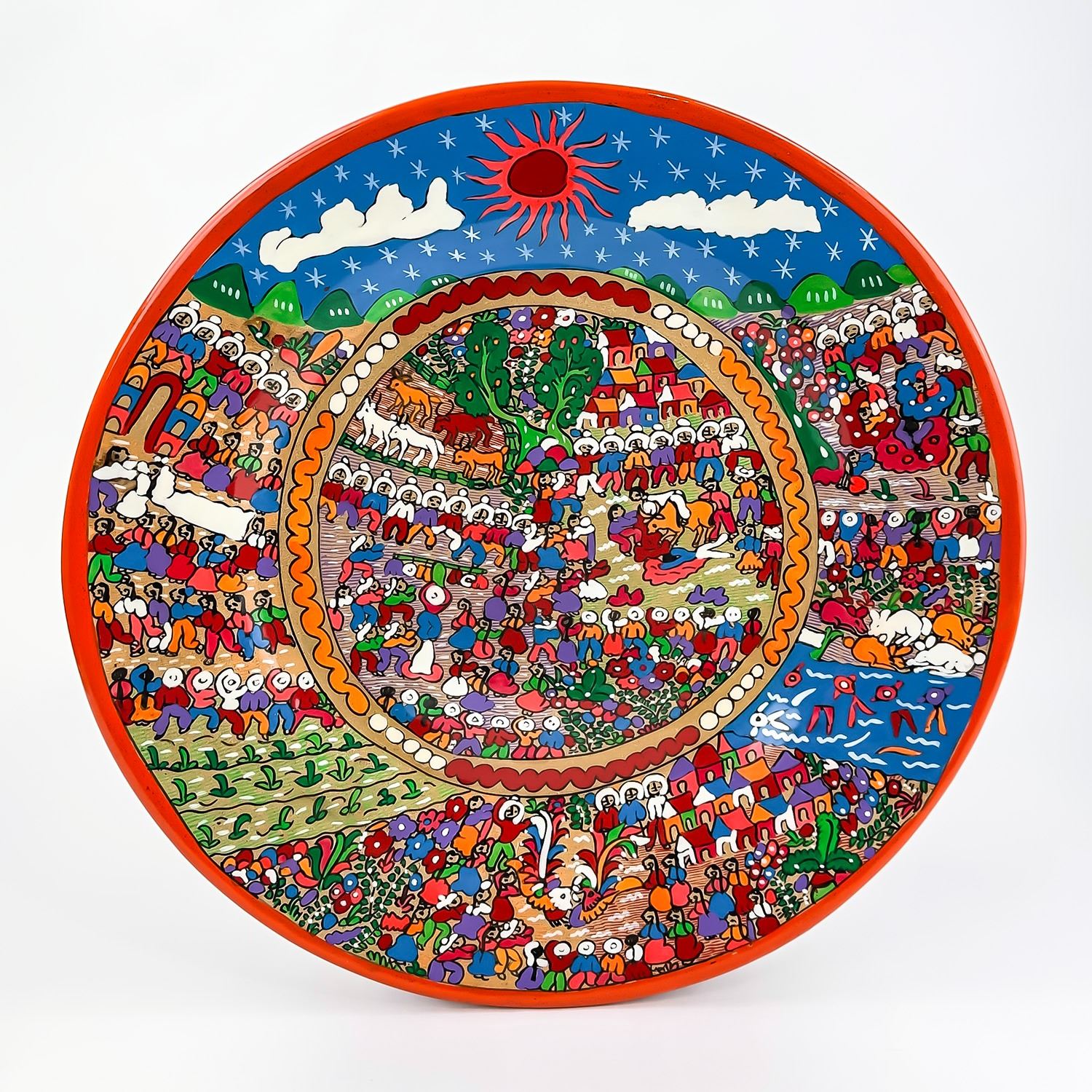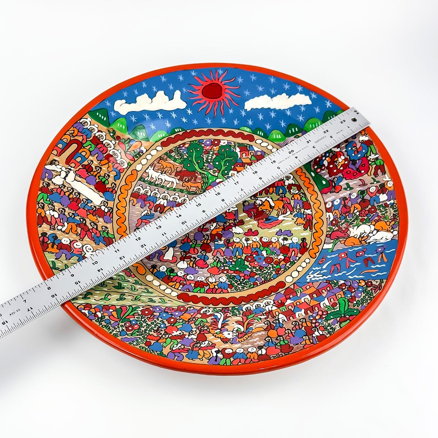 #9035 - MEXICAN FOLK ART TERRACOTTA WEDDING PLATE ART SCULPTURE. HAND CRAFTED & PAINTED WALL DECOR. HOME OR OFFICE WALL PLAQUE CHARGER. NO CRACKS, CHIPS OR REPAIRS. MEASURES 16” (40.75 CM) DIAMETER.