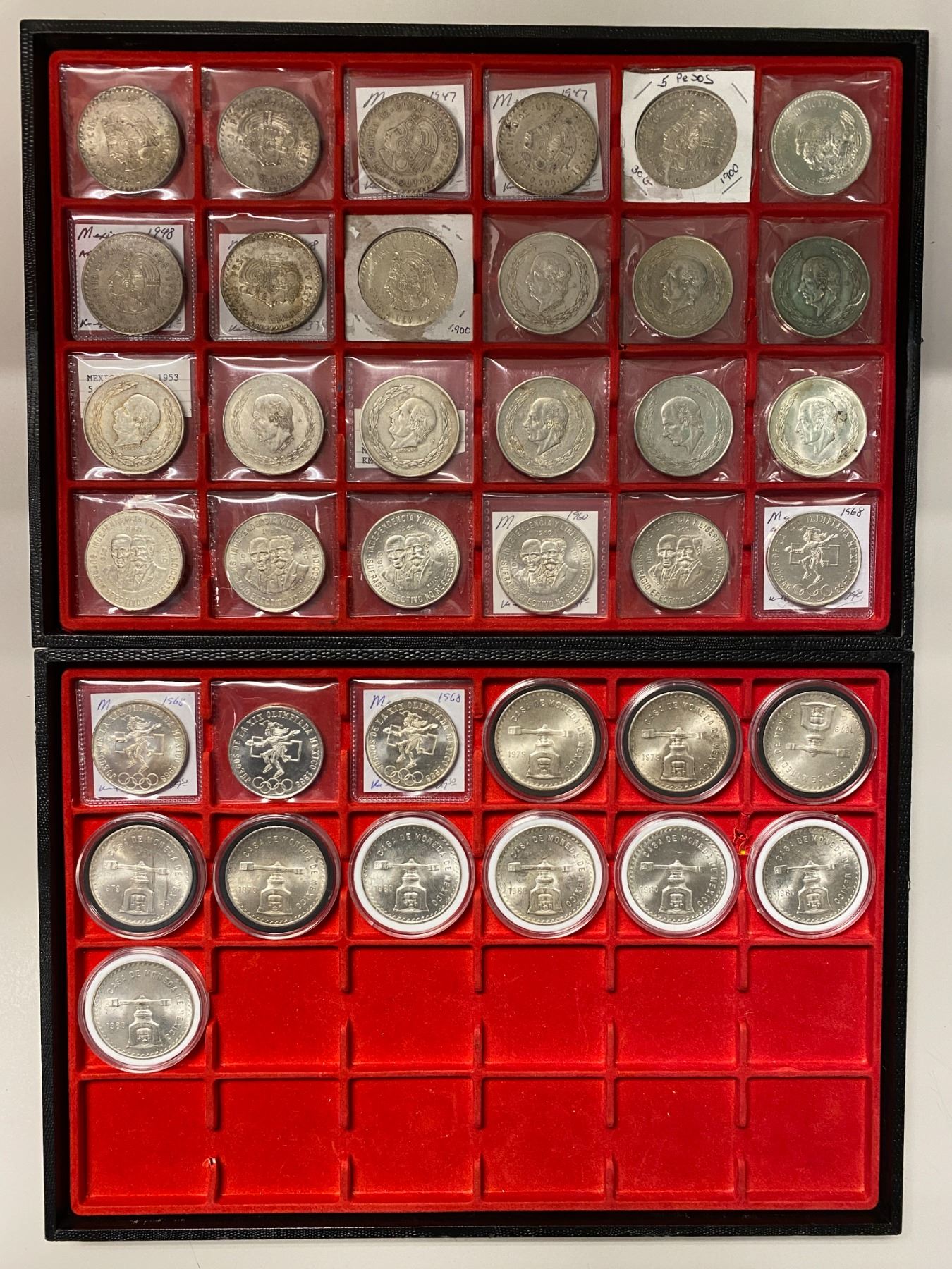 MEXICO: LOT of 37 coins, all silver crown-sized, including Cuauhtemoc 5 pesos (9 pcs), Hidalgo 5 pesos (9), Hidalgo/Madero 10 pesos (5), Olympic 25 pesos (4), and 1979-80 onza (10); average circulated grades, with some uncs, in consignor's 2x2 holders, viewing recommended; retail value $1075, lot of 37 coins.