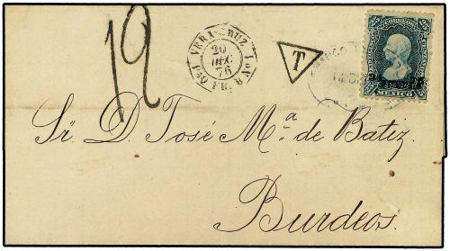 1876 Letter sheet used to BURDEOS (Bordeaux) bearing 25 c. PUEBLA ovpt showing the hs ´T´ marking in black with the VERA CRUZ PAQ FR Nº1. octagonal ds in black alongside.