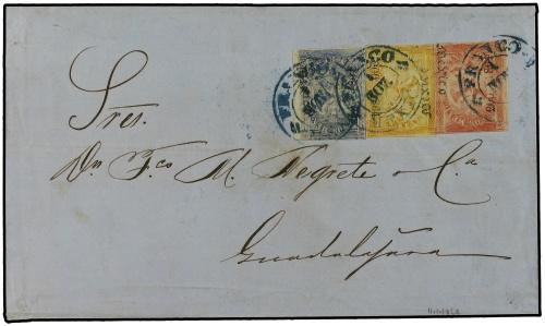 21a+23+25a 1864 (Nov 1) MEXICO CITY. Large part cover to GUADALAJARA with superb Eagle 3rd period three colour franking of 1r. blue, 2r. yellow and 8r. carmine (all Inv. 200-1864) tied by blue FRANCO/MEXICO cds´s. Only 300 of the 8 real value were invoiced. A delightful and very rare cover. Ex collection J.K. Bask.