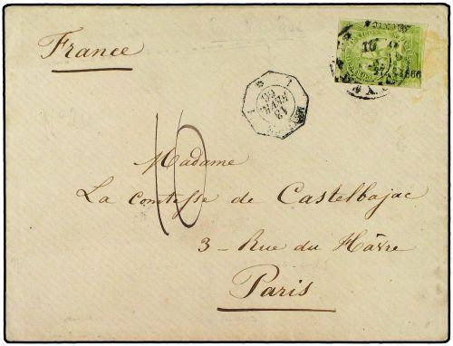 1866 MEXICO a PARIS. 4 reales verde, circulada por el correo francés. Fechador octogonal MEXICO/*.