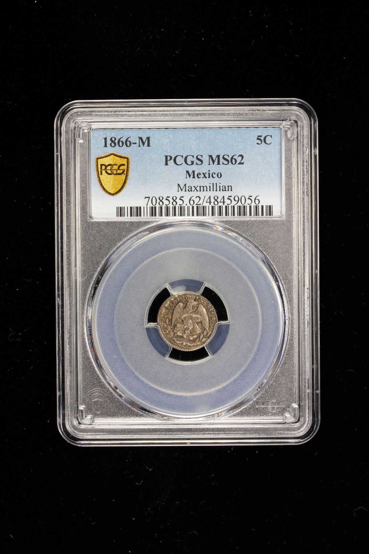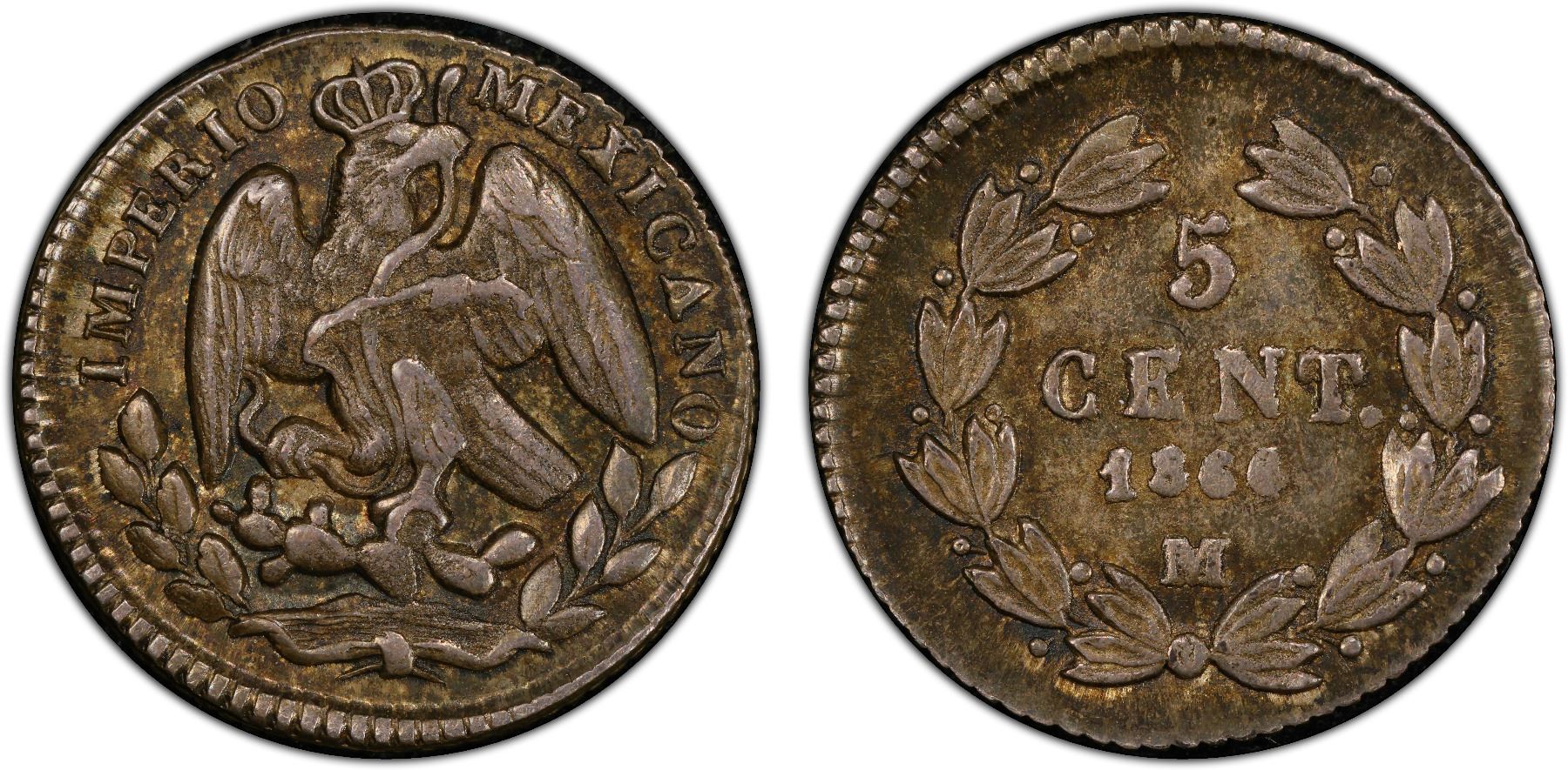MEXICO: Maximiliano, 1864-1867, AR 5 centavos, 1866/4-M, KM-385.1, overdate variety, very rare in mint state for this date, tied for the finest grade at PCGS, PCGS graded MS62, RR. Dated as 1866-M on the holder, though the overdate is sufficiently clear in our opinion.