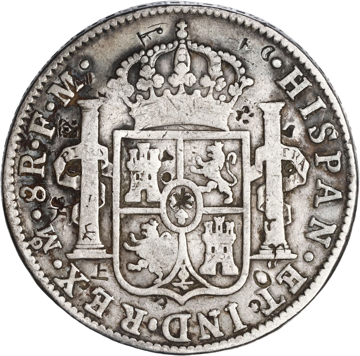 MEXICO, Mexico City, bust 8 reales, Charles IV, 1800 FM, with several small Asian chopmarks, ex-Brameld. Yonaka-M8.100; KM-109; Cal-965. 26.54 grams. Fine host coin with numerous small chopmarks and one bold oval chop with raised dots inside, dark gray toning around the legends. Pedigreed to the David Brameld Collection.