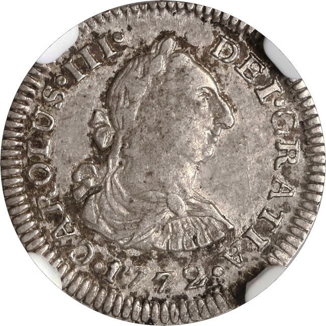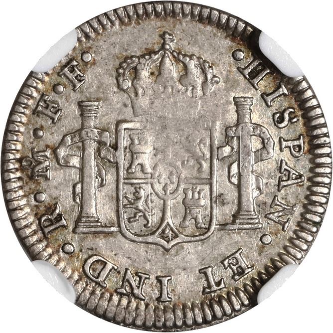 MEXICO, Mexico City, bust ½ real, Charles III, 1772 FF, NGC AU 53. Yonaka-M05.72a; Cal-194; KM-69.2. Broad flan, somewhat crusty toning with rainbow colors over luster near rim on reverse, this scarce variety most likely an error from 1782 where the engraver punched in a second 7 instead of an 8 for the date, since assayer FF did not start on ½R till 1779.