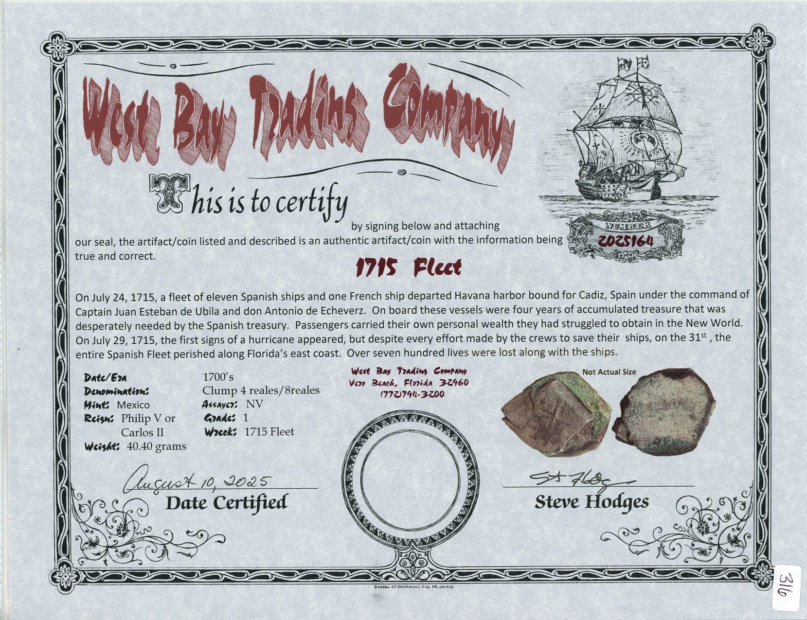MEXICO, Mexico City, clump of one 8R and one 4R, probably both Philip V, assayers not visible, partially encrusted. 40.41 grams total. Two very solid coins fused together, the rhomboid 4R with nearly full cross showing through dark toning but the roundish 8R complete covered in green and gray encrustation, a very neat albeit compact display. With photo-certificate. Recovered from: Spanish 1715 Fleet, sunk off the east coast of Florida