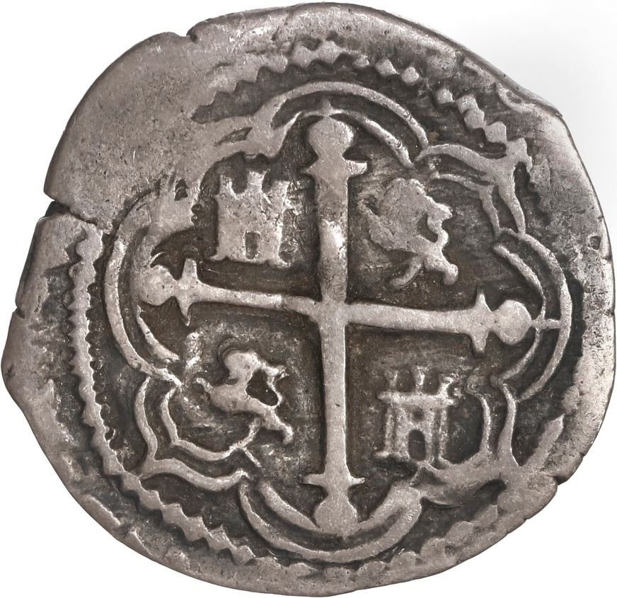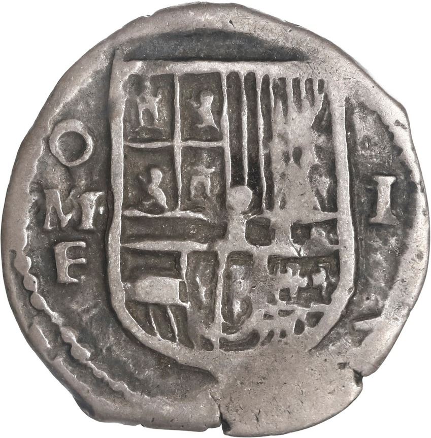 MEXICO, Mexico City, cob 1 real, Philip III, assayer F, ex-Hubbard. 3.22 grams. Bold XF, struck on a circular planchet with full shield and clear mintmark and assayer, choice full cross, deeply toned. Pedigreed to the Clyde Hubbard Collection, with his tag.