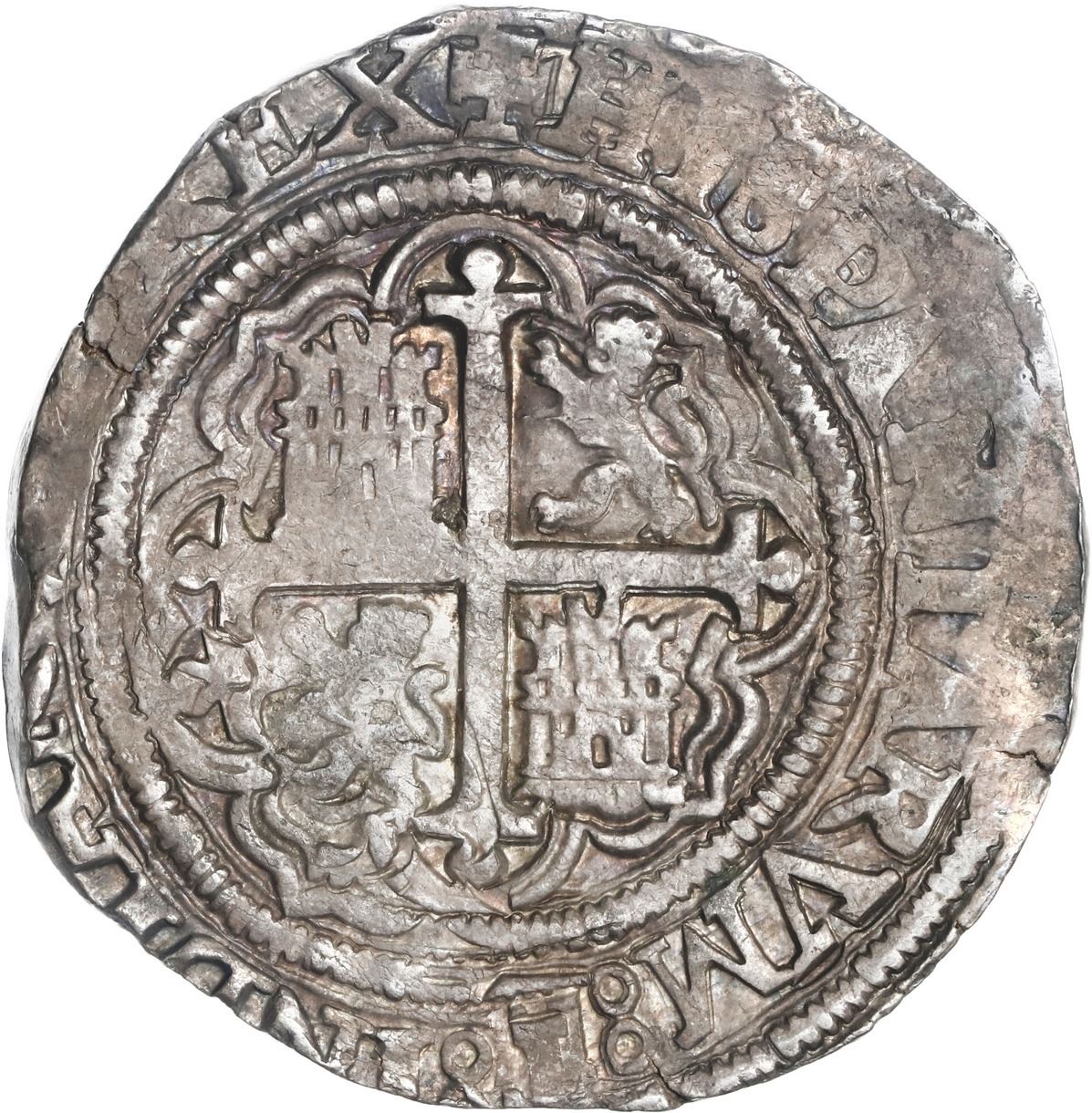 MEXICO, Mexico City, cob 4 reales, Philip II, assayer O below mintmark oM to left, ex-Hubbard. S-M11; KM-36; Cal-505. 13.73 grams. Broad flan with mostly bold legends (some flat) including full king's name rendered as PHILPPVS due to doubling, choice full shield with oMO to left, good full crown and cross-lions-castles, lightly rainbow-toned AU-. Pedigreed to the Clyde Hubbard Collection, with his tag.