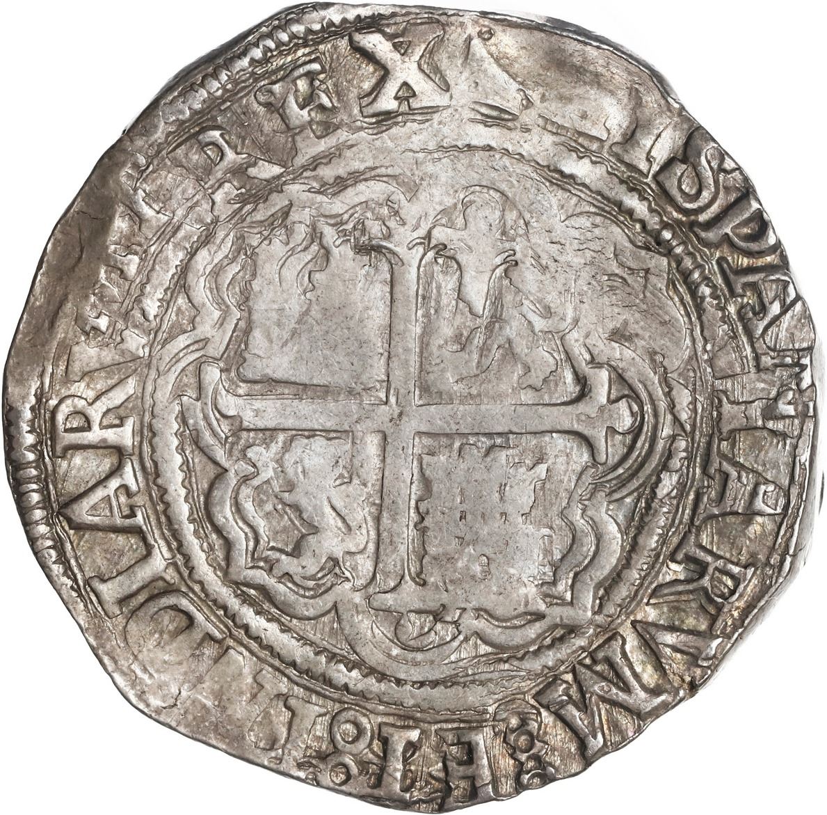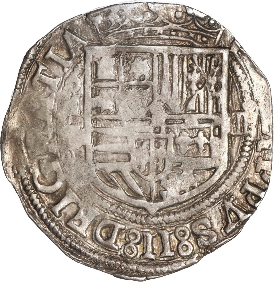 MEXICO, Mexico City, cob 4 reales, Philip II, assayer O below mintmark oM to left, ex-Hubbard. S-M11; KM-36; Cal-505. 13.72 grams. Round but slightly unevenly thick flan with some weak spots in otherwise full shield and cross-lions-castles, nearly full legends including bold king's ordinal II with figure-eight stops, XF with very light rainbow toning. Pedigreed to the Clyde Hubbard Collection, with his tag.