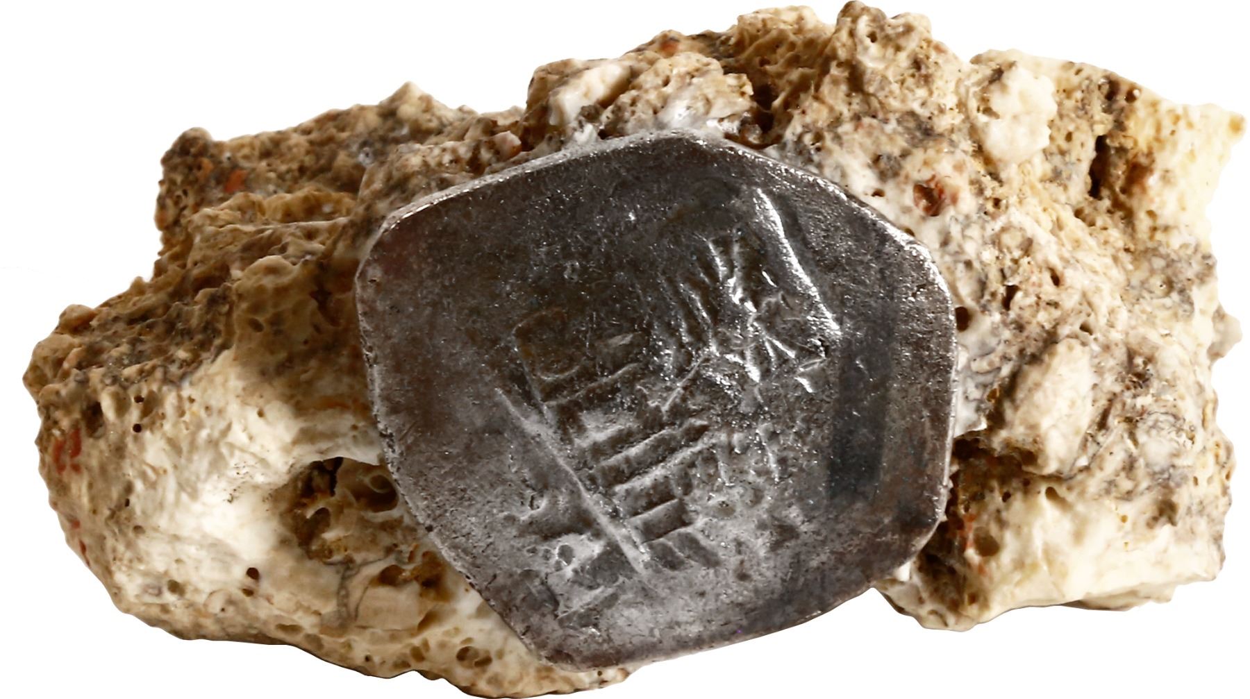MEXICO, Mexico City, cob 4 reales, Philip IV, assayer P, single coin embedded in a chunk of coral, a