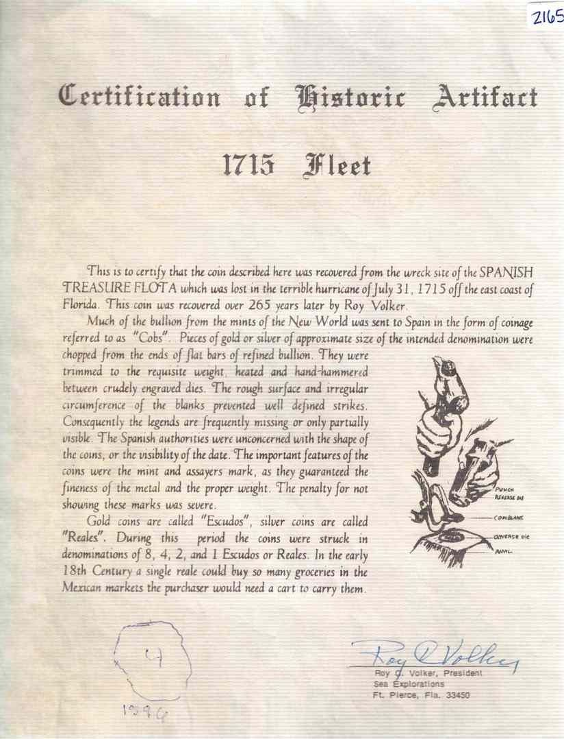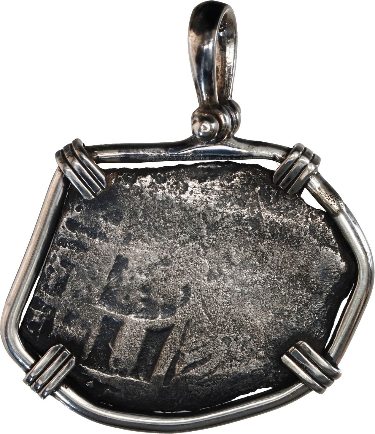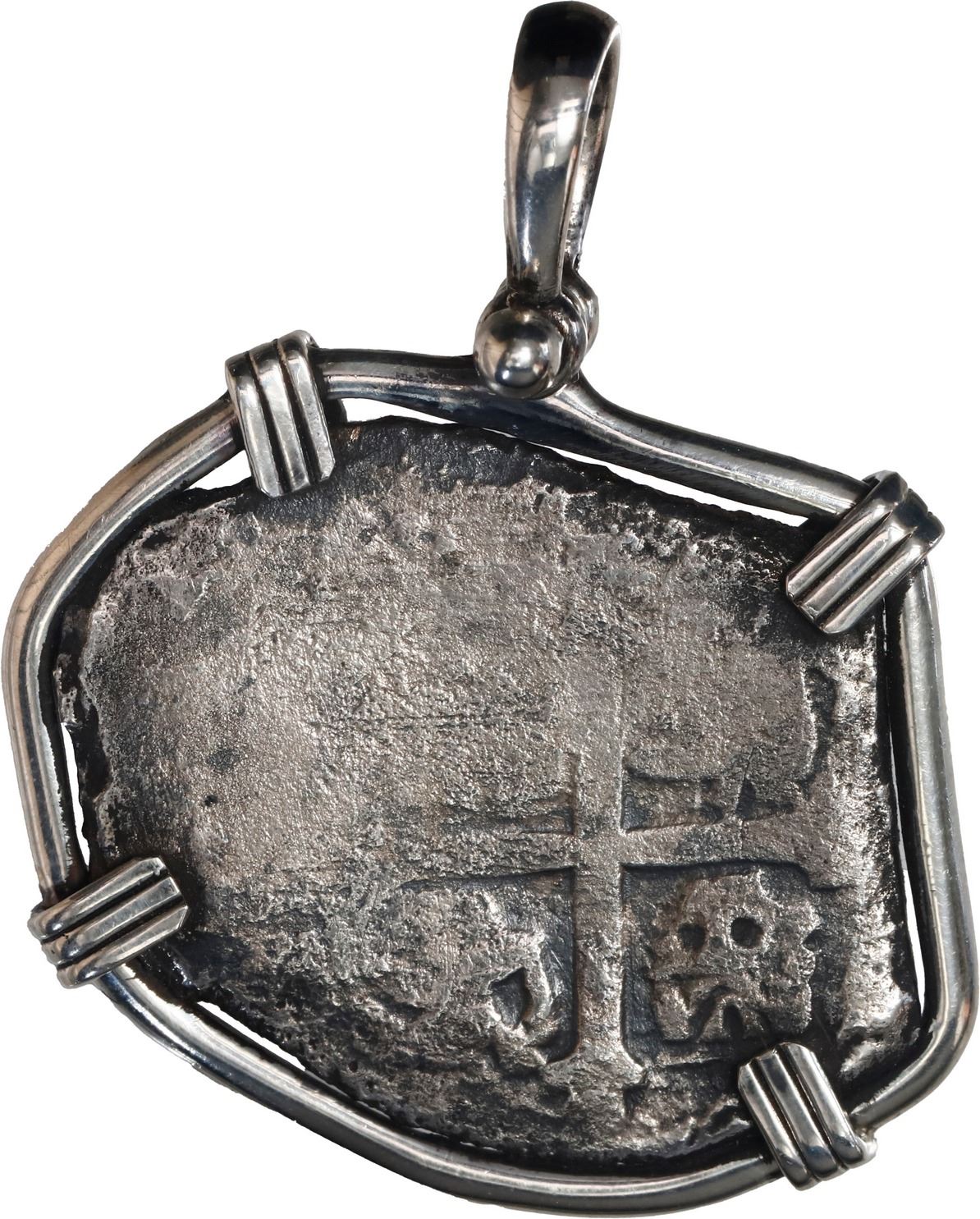 MEXICO, Mexico City, cob 4 reales, Philip V, assayer not visible (J), style of 1712-13, ex-1715 Fleet, mounted cross-side out in silver pendant with shackle bail. 16.60 grams total. Solid example from the popular 1715 Fleet with light surface corrosion and bold partial shield and cross, fairly silvery with some dark tones around the edges. From the 1715 Fleet, with certificate. SOLD FOR THE BENEFIT OF THE 1715 FLEET SOCIETY.