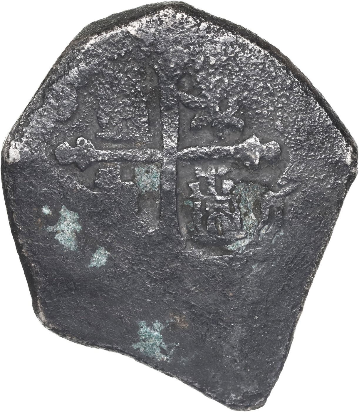 MEXICO, Mexico City, cob 8 reales, 1714 J, new style shield, old style cross, ex-Pullin. S-M22; KM-47; Cal-1401. 25.41 grams. Off-center strike resulting in a choice full date outside of full oM (only the top-left part of the shield visible), well-centered full cross, dark as uncleaned, with light corrosion and spots of green encrustation on reverse. Pedigreed to the John Pullin collection. Recovered from: Spanish 1715 Fleet, sunk off the east coast of Florida