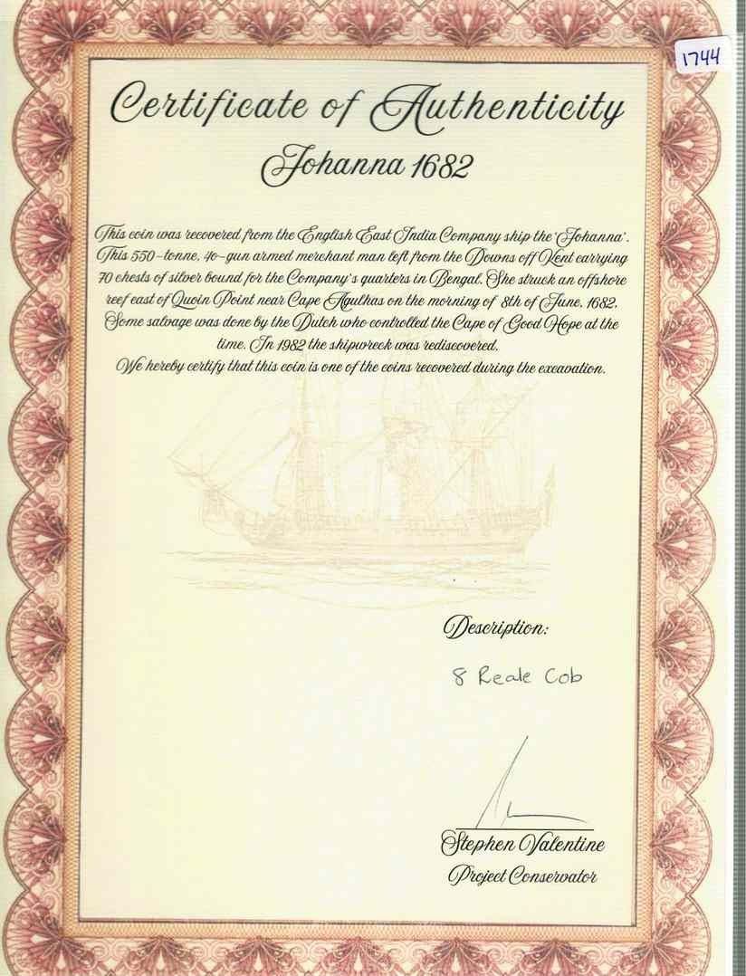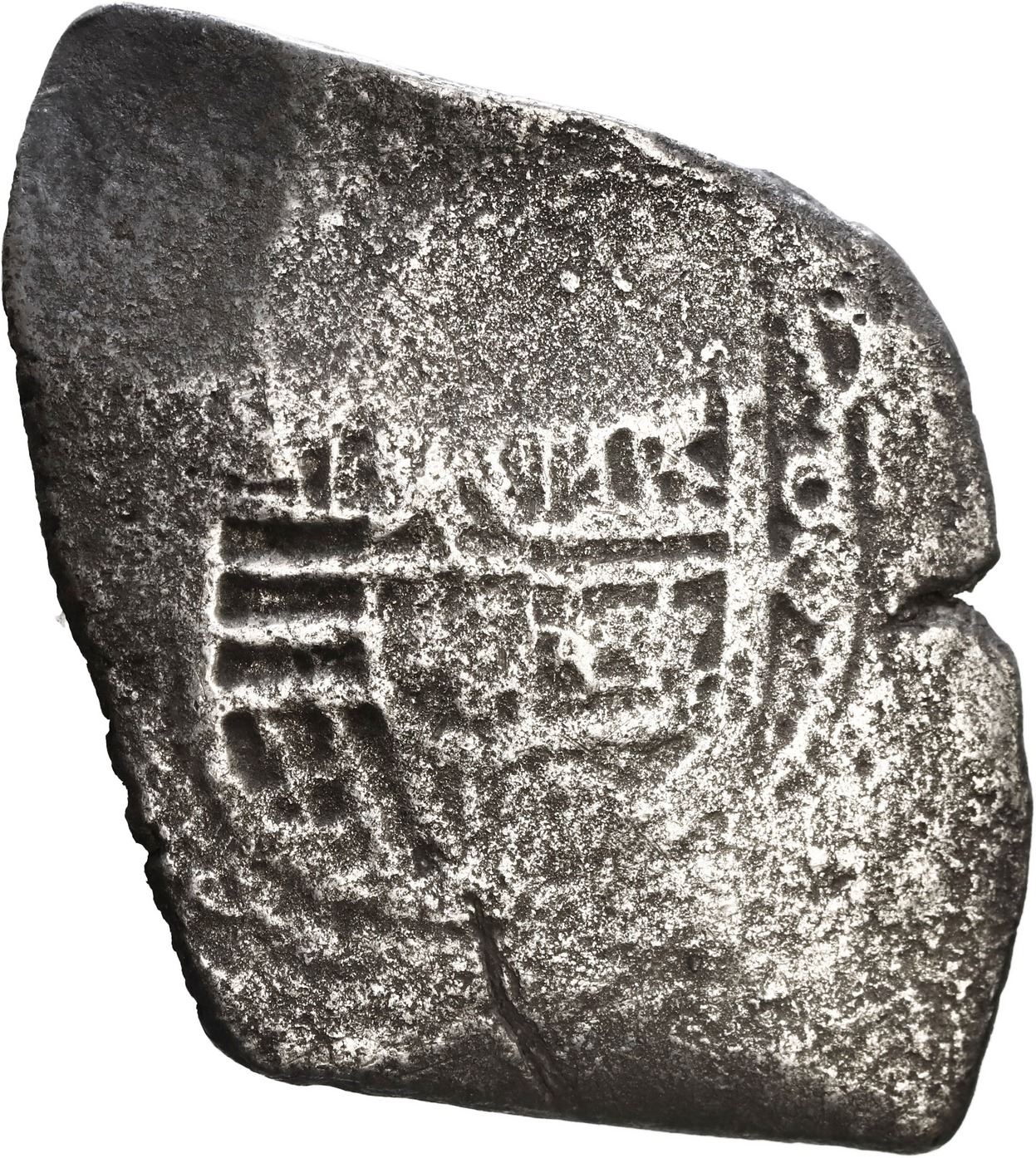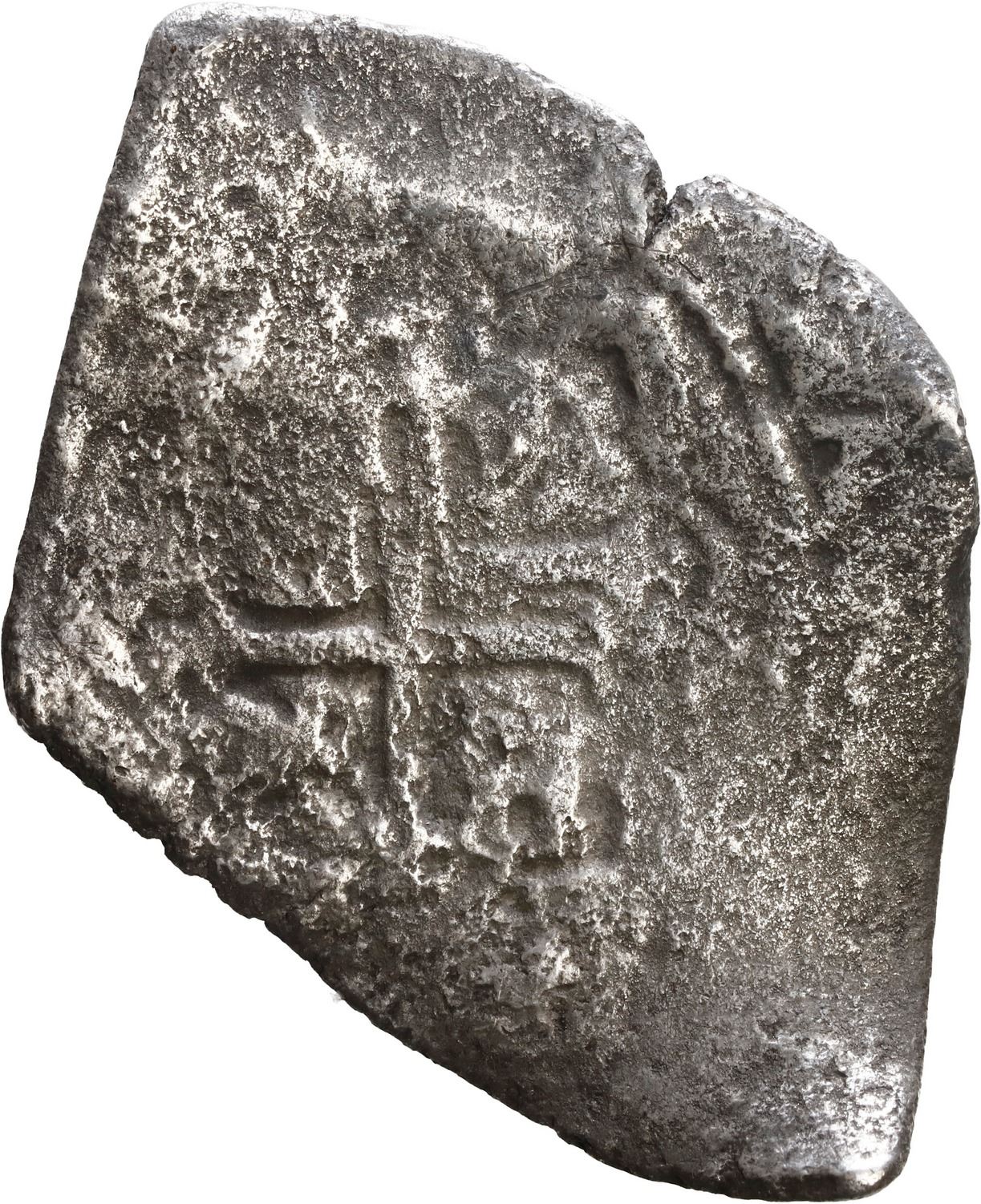 MEXICO, Mexico City, cob 8 reales, Charles II, assayer not visible. KM-46; Cal-Type 108. 19.06 grams. Unusually shaped piece with one corner turned upward, weak yet nearly complete shield and cross with significant doubling on the latter. Pedigreed to the Steve Valentine Collection, with original certificate from the salvor/conservator. Recovered from: Joanna, sunk in 1682 off South Africa