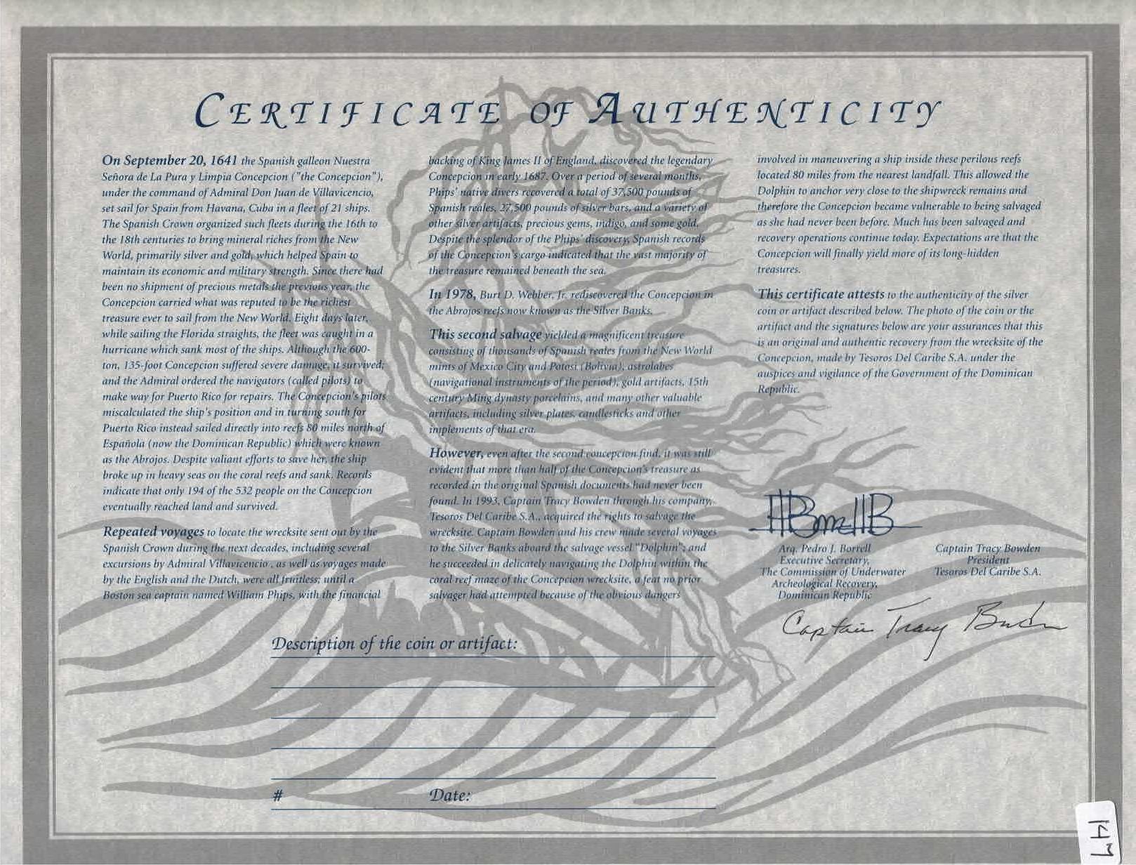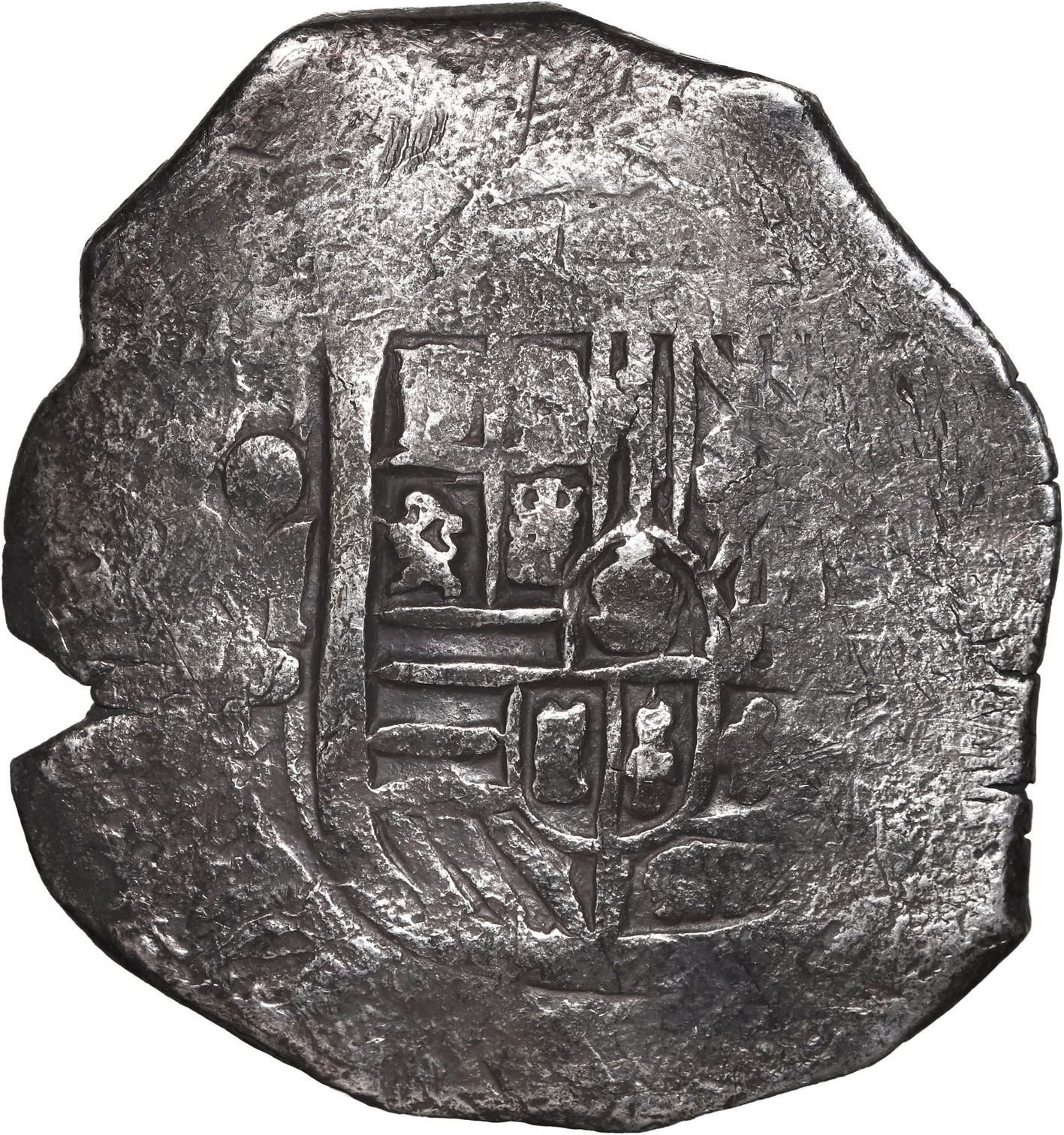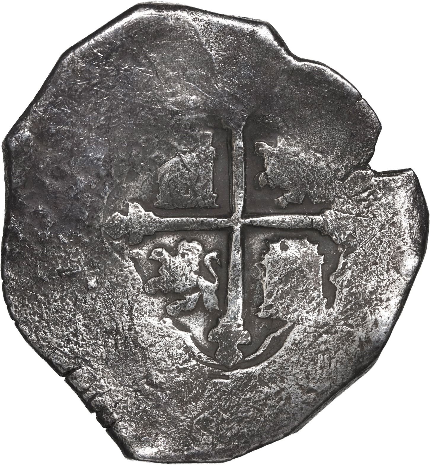 MEXICO, Mexico City, cob 8 reales, Philip IV, assayer P. S-M19; KM-45; Cal-Type 319. 25.60 grams. Broad flan with flat peripheries, good full cross and most of shield, toned with minimal surface corrosion, small edge-split. With original certificate from Captain Tracy Bowden through his contract with the Dominican Republic. Recovered from: Concepción, sunk in 1641 off Hispaniola