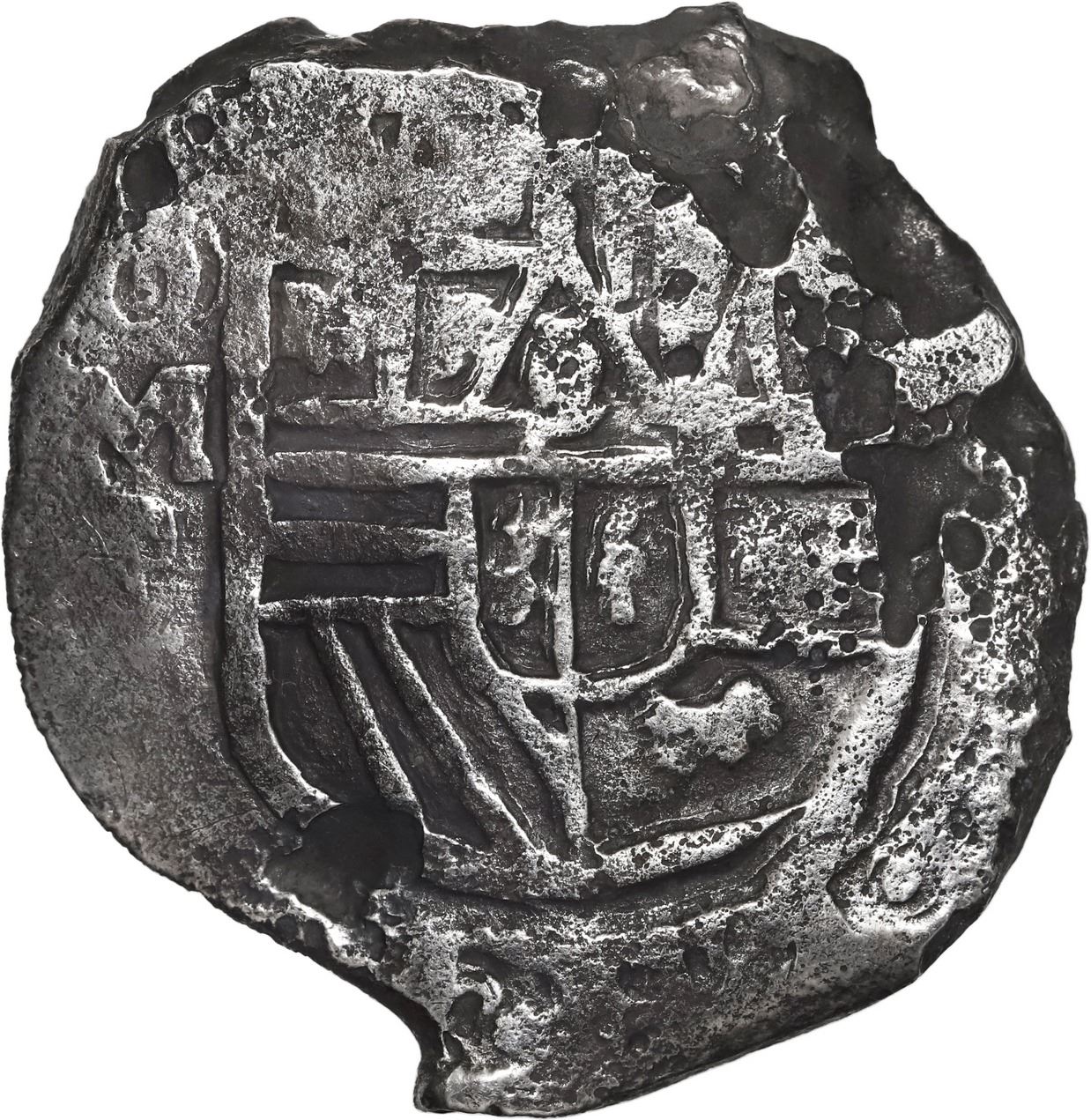 MEXICO, Mexico City, cob 8 reales, Philip IV, assayer P. S-M19; KM-45; Cal-Type 319. 24.19 grams. Choice full cross and nearly full shield but somewhat truncated from corrosion on edge, deeply toned in crevices for good contrast. With original certificate from Captain Tracy Bowden through his contract with the Dominican Republic. Recovered from: Concepción, sunk in 1641 off Hispaniola