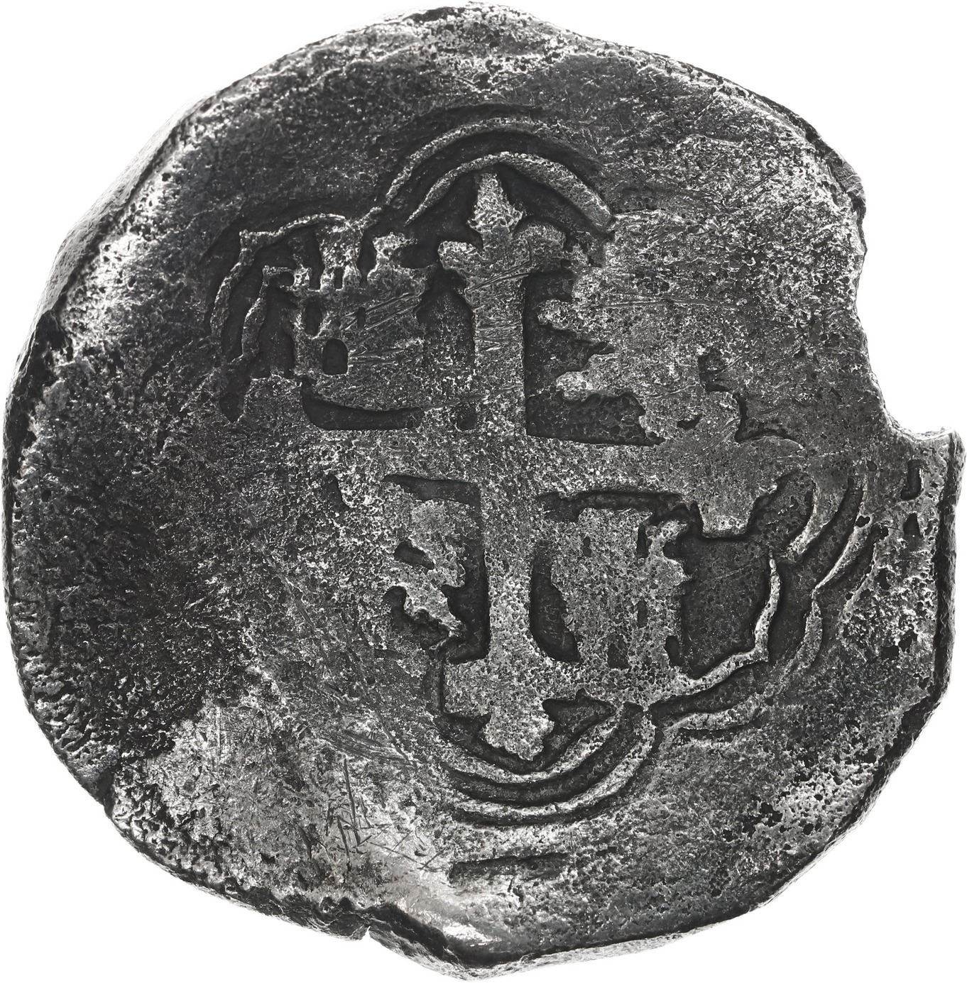 MEXICO, Mexico City, cob 8 reales, Philip IV, assayer not visible (D, late 1620s to early 1630s). S-M18a; KM-45; Cal-Type 319. 25.11 grams. Full denomination 8, most of shield and cross despite flatness and light surface corrosion, small piece of edge missing, toned all over. With original certificate from Captain Tracy Bowden through his contract with the Dominican Republic. Recovered from: Concepción, sunk in 1641 off Hispaniola