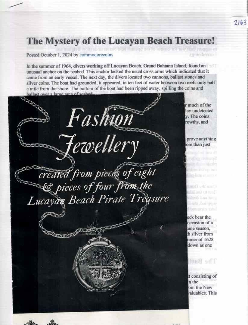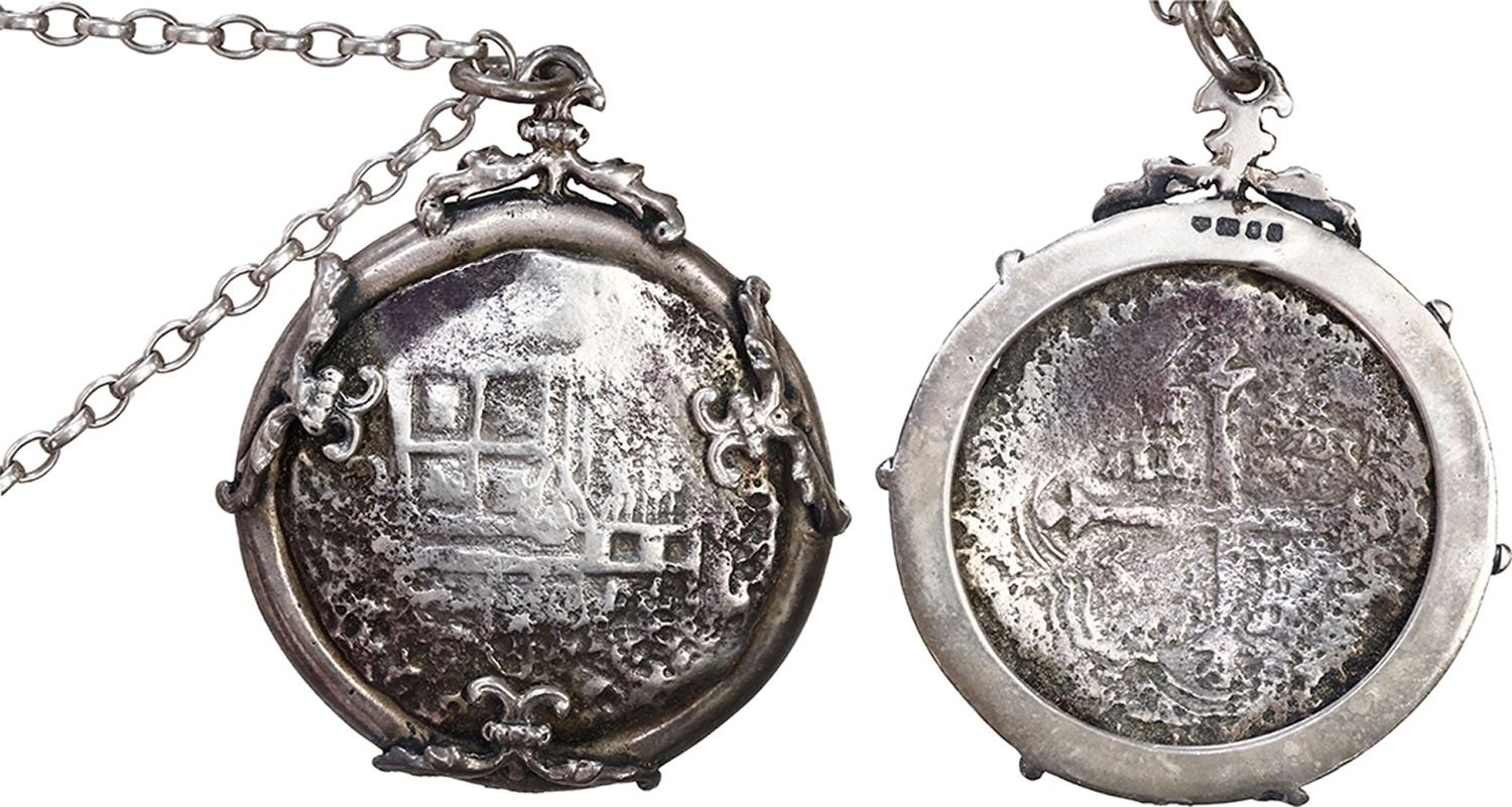 MEXICO, Mexico City, cob 8 reales, Philip IV, assayer not visible, ex-"Lucayan Beach Wreck" (ca. 1628), ex-Spink, mounted shield-side out in antique silver bezel with silver chain. 46.10 grams total. Solid piece with most of shield and cross visible amid surface pitting from saltwater corrosion, richly toned with purple hues. From the "Lucayan Beach Wreck" (ca. 1628), with original Spink box and advertisement "Fashion Jewellery created from pieces of eight & pieces of four from the Lucayan Beach Pirate Treasure" (1960s), plus 2024 essay about the wreck.