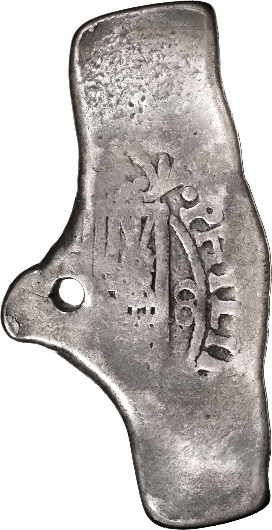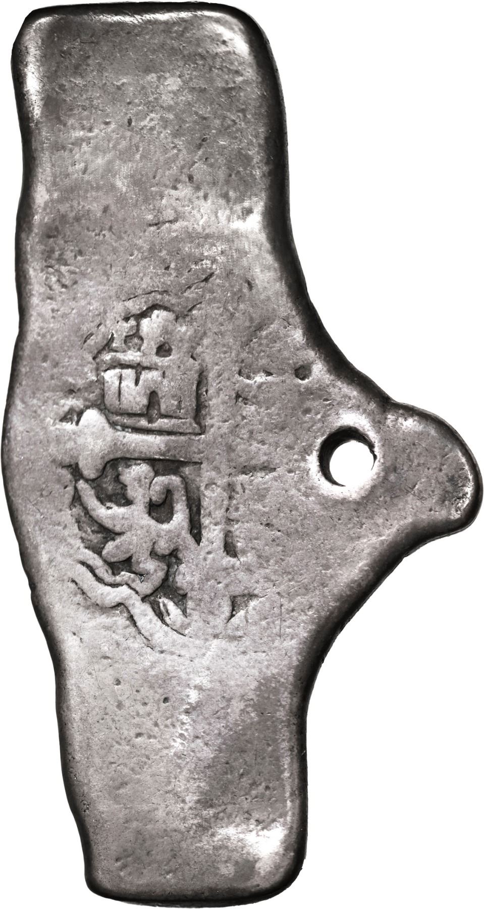 MEXICO, Mexico City, cob 8 reales, Philip V, assayer not visible (L, 1702-5), very odd shape, ex-Hubbard. S-M21a; KM-47; Cal-Type 170. 26.48 grams. Basically a 2½"-long thin rectangle with ½" protrusion on one side in middle (with old hole there), mostly flat and weak (toned VG) yet with remarkably bold PHILIP(PVS) and denomination 8, plus one full castle and lion of a distinctive pre-assayer J style, very eye-catching and interesting. Pedigreed to the Clyde Hubbard Collection, with his tag.