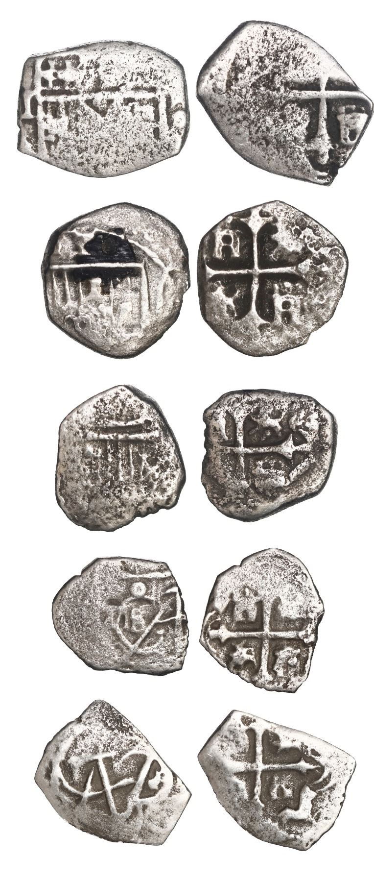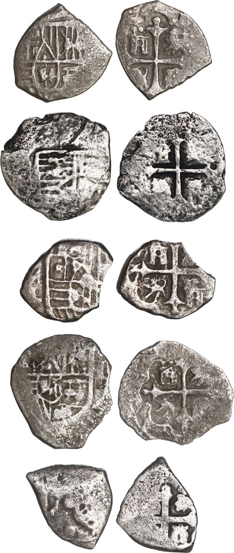MEXICO, Mexico City, lot of ten cob 1R and ½R, Philip IV or Charles II, assayer L or not visible. 17.52 grams total. Choice group of minors with seven 1R (one with assayer L visible) and three ½R present, all with bold shields / monograms and crosses, difficult to find from this wreck in quantity and quality. Pedigreed to the Steve Valentine Collection, with original certificate from the salvor/conservator. Recovered from: Joanna, sunk in 1682 off South Africa