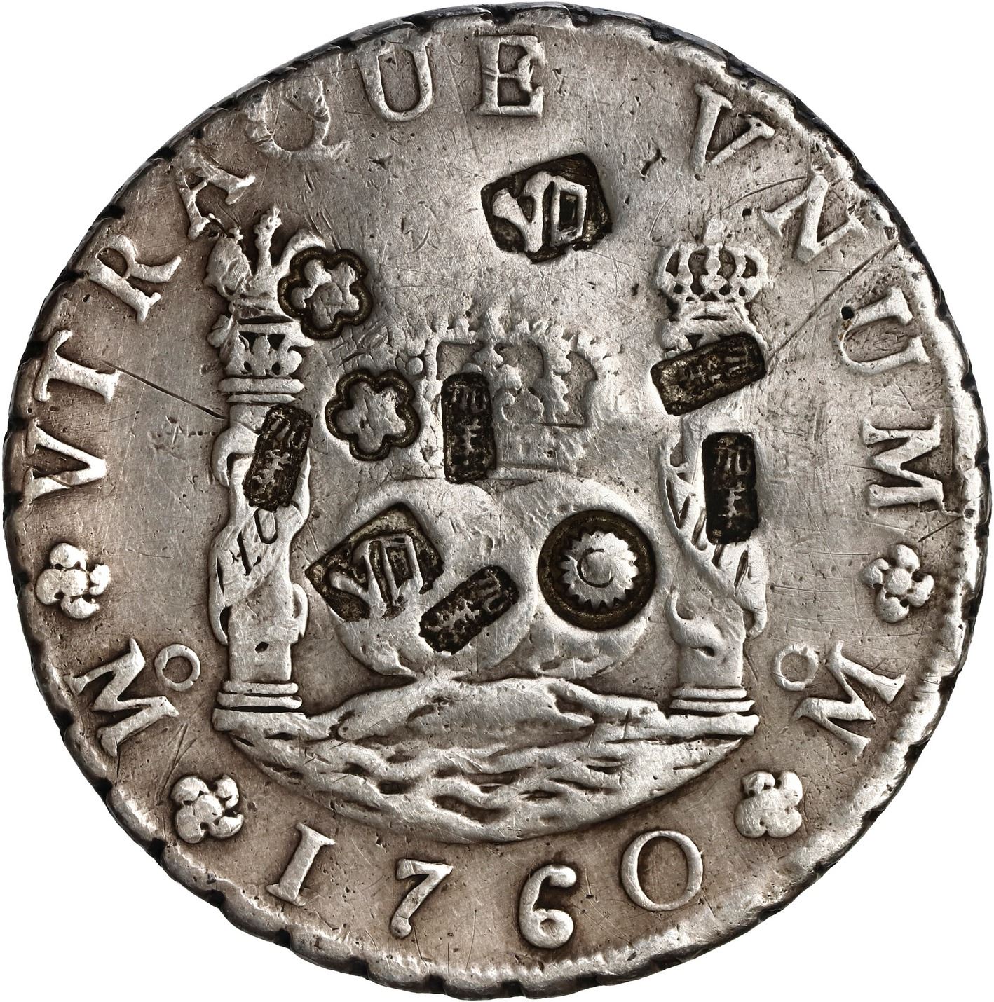 MEXICO, Mexico City, pillar 8 reales, Charles III, 1760 MM, with many clear Asian chopmarks, ex-Brameld. Yonaka-M8.60b; Cal-1073; KM-105. 26.57 grams. XF or so, very lightly toned, with ten distinct but unidentified chops on the pillars side (only) believed to be non-Chinese and more like countermarks in nature (raised inside boxes, etc) but clearly Asian characters. Pedigreed to the David Brameld Collection.