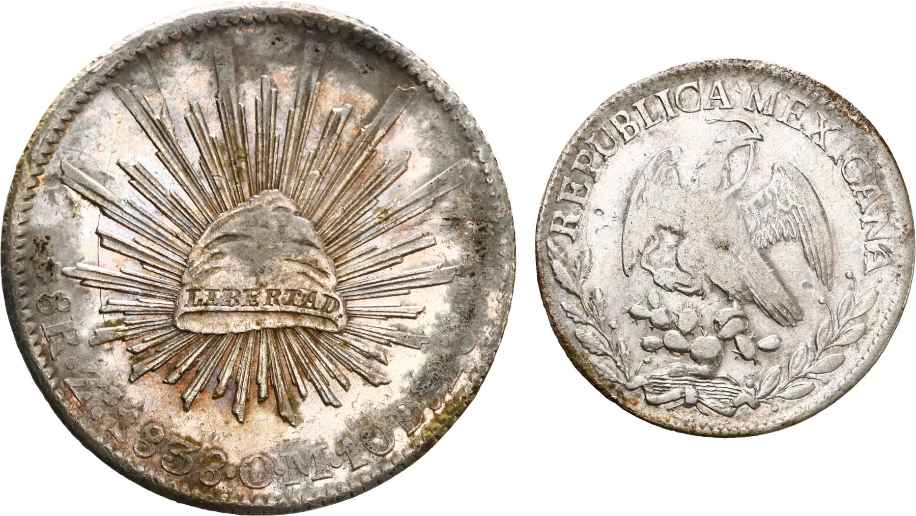 MEXICO, two-coin set of cap-and-rays 8R and 2R, 1838 ZsOM and 1827 MoJM respectively, ex-"New Orlean