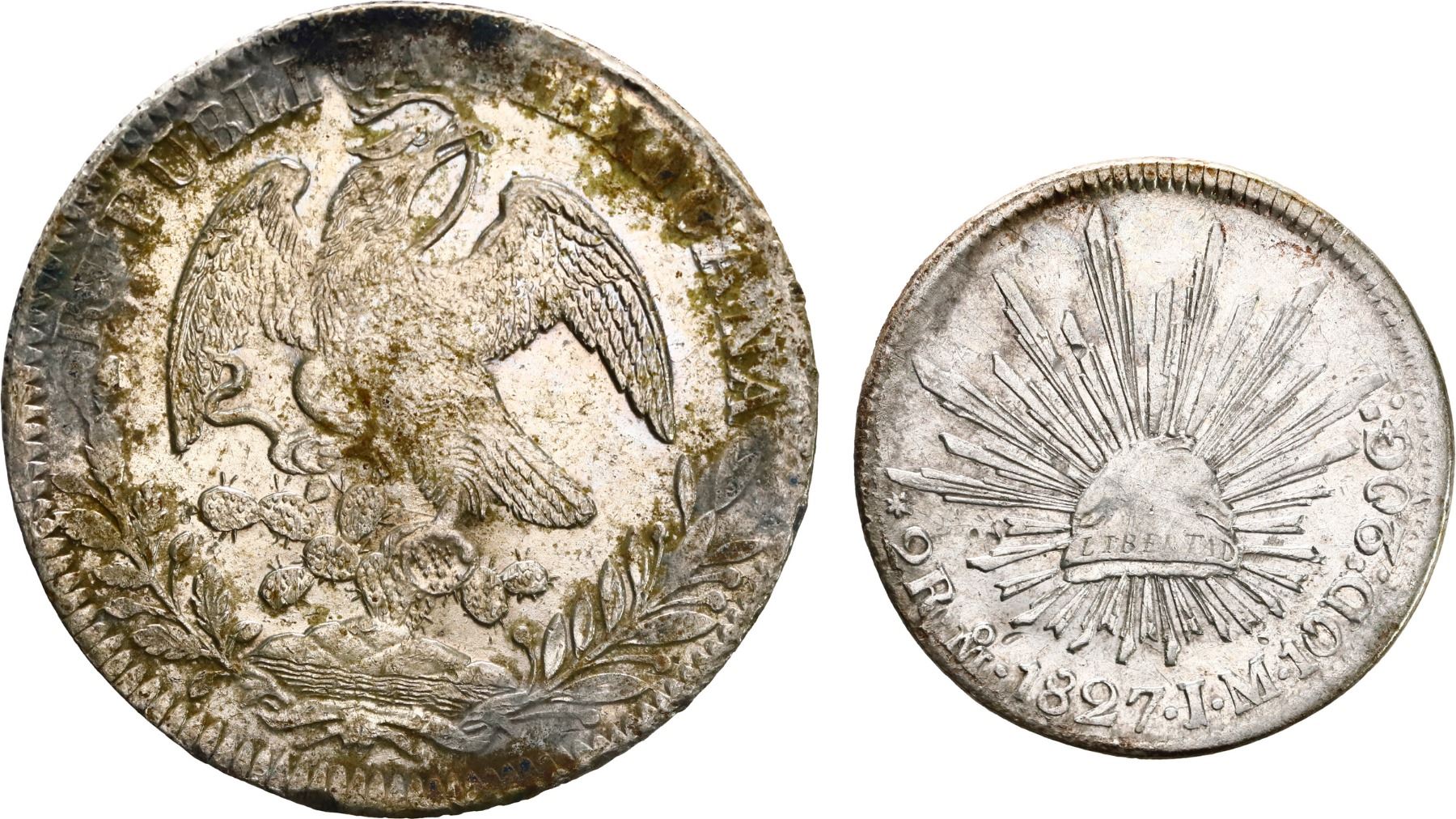 MEXICO, two-coin set of cap-and-rays 8R and 2R, 1838 ZsOM and 1827 MoJM respectively, ex-"New Orleans hoard." KM-377.13, DP-Za18 (8R); KM-374.10 (2R). 32.93 grams total. Both coins recovered on October 29, 1982, from one of two wooden boxes uncovered by a construction operation in the French Quarter of New Orleans that led to businesspeople and passersby digging in the mud for coins. The 8 reales is AU with significant luster amid minor encrustation while the 2 reales is XF; both coins exhibit light corrosion around the rims. From the "New Orleans hoard," found in 1982, with original 1986 certificates in wallet-type folio, pedigreed to Sedwick Auction 21, with original lot-tag 1627.