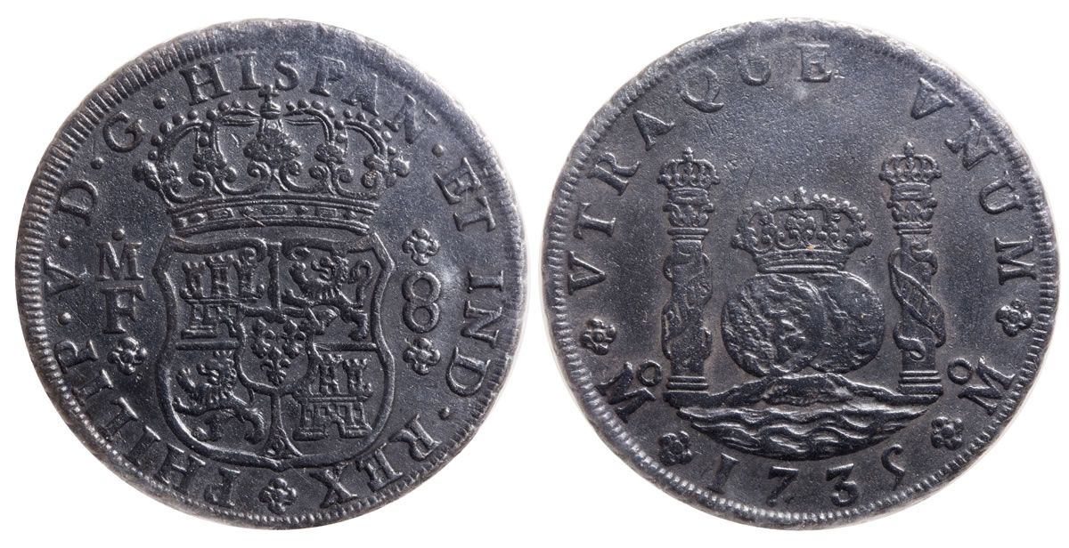 8 Reales 1735 Mo. KM. 103. This coin is certified as having been salvaged from the 1761 shipwreck of the Auguste off the coast of Nova Scotia. No. ST 188. ICCS graded Extremely Fine-40.