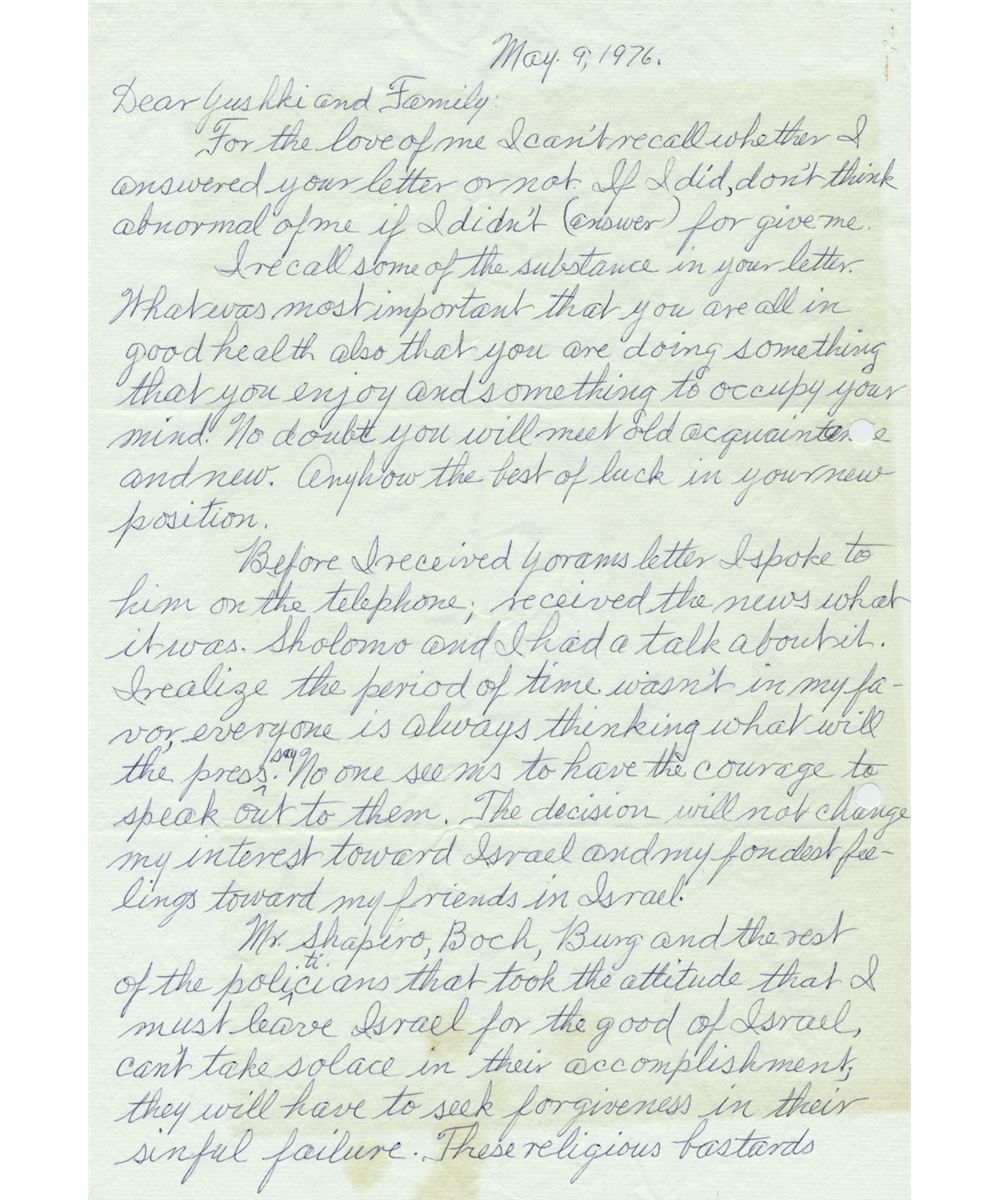 (1902 - 1983) Mafia "founding father" and accounting genius, close friend and associate of "Lucky" Luciano, Joe Adonis, "Bugsy" Siegel and Albert Anatasia, involved in nationwide rackets whose profits he laundered through legitimate businesses. He fled to Israel to avoid prosecution in 1970, but was denied citizenship after a long court battle and returned to the U.S. on Nov. 7, 1972 where he was arrested aboard the airplane to face trial. He would be acquitted of all charges in 1974, but spent the interim, and the rest of his life fighting for Israeli citizenship. Good content rare A.L.S. Shalom, Meyer", 3pp. 4to., [Miami], May 9, 1976 to his friend Joseph (Yoskeh) Sheiner, a member of the Israeli Security Agency and Prime Minister David Ben-Gurion's director of security in the 1960s. Sheiner accompanied Lansky on his famous 36 hour flight seeking asylum and secretly tried to obtain him asylum in Paraguay. In part: "...The decision [not to allow his immigration] will not change my interest toward Israel and my fondest feelings towards my friends in Israel...Mr. [Israeli Judge] Shapiro, Boch, Burg and the rest of the politicians that took the attitude that I must leave Israel for the good of Israel can't take solace in their accomplishment; they will have to seek forgiveness in their sinful failure. These religious bastards (Mr. Burg and that bitch of a woman) who gave me the pass-port knew they were committing a cardinal sin when they said you can travel with this pass-port but they didn't lose any time turning me over to the press and police...they better pay more attention to the bearded thieves and the narcotic peddlers that are travelling between Israel and Germany...only one [sin] remains unforgiveable being born a Jew...condemn all Jews because of a few Jews dealing in narcotics because they no doubt bought from an Arab or Christian. We have no apologies to make to Christians...because of a wrong of one Jew...brought about by their denials to let us live like human beings...we also gave them the atomic bomb to blow themselves up with...I'm still kept busy with subpoenas...". File holes at one margin affect a few letters in text, else very good.