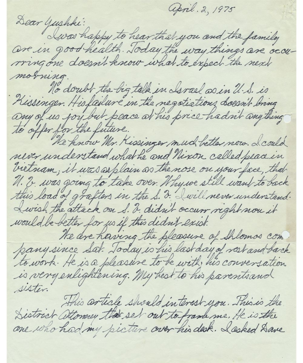 (1902 - 1983) Mafia "founding father" and accounting genius, close friend and associate of "Lucky" Luciano, Joe Adonis, "Bugsy" Siegel and Albert Anatasia, involved in nationwide rackets whose profits he laundered through legitimate businesses. He fled to Israel to avoid prosecution in 1970, but was denied citizenship after a long court battle and returned to the U.S. on Nov. 7, 1972 where he was arrested aboard the airplane to face trial. He would be acquitted of all charges in 1974, but spent the interim, and the rest of his life fighting for Israeli citizenship. Good content very rare A.L.S. "Meyer", 2pp. 4to., [Miami], Apr. 2, 1975 to his friend Joseph (Yoskeh) Sheiner, a member of the Israeli Security Agency and Prime Minister David Ben-Gurion's director of security in the 1960s. Sheiner accompanied Lansky on his famous 36 hour flight seeking asylum and secretly tried to obtain him asylum in Paraguay. Lansky gloats over the downfall of one of his prosecutors, in part: "...No doubt the big talk in Israel as in the U.S. is Kissinger. His failure in the negotiations doesn't bring any of us joy...I could never understand what he and Nixon called peace in Vietnam...Why we still want to back this load of grafters in S[outh] V[ietnam]...This article should interest you. This is the District Attorney that set out to frame me. He is the one who had my picture over his desk. I asked Dave to ask McMillan for a picture of him, I have a good place to put it. He is fired but he will be given a chance to resign although he may have violated the law in his zealous attempts to prosecute people...". File holes, light toning, else very good. Sold with a clipping from the Miami Herald reporting on the resignation of Justice Department Organized Strike Force head Dougald MacMillan following accusations of improper investigations by IRS agents.
