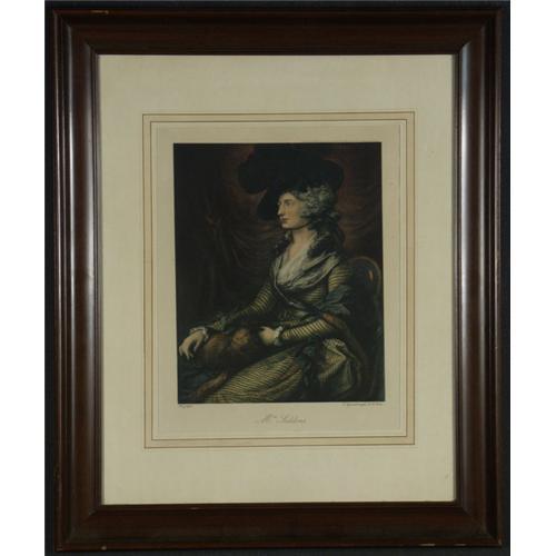MEZZOTINT 16 3/4'' x 13 3/8'', Thomas Gainsborough (1727-1788), United Kingdom. ''Mrs. Giddens''. Titled lower center, identified 'Mezzotype' lower left, artist info. lower right, copyright info. top right. Some foxing on outer edges and matting but does not appear to affect interior of piece. Matted with decorative trimming and placed in a wood frame, note chipping, as seen. Although Gainsborough's first love was for landscape painting, he made his living painting portraits and was the most popular portrait painter of his time. More info. in the white binder.
