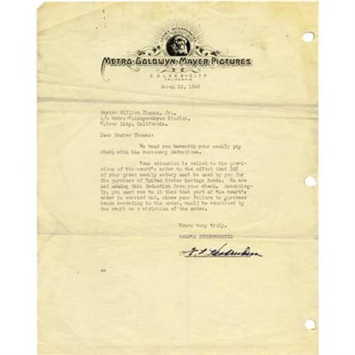 <B>MGM Agreement and Court Order Letter to Buckwheat.</B></I> A fascinating packet that includes a three-page court order, dated February 25, 1943, "in the Matter of the contract between Loew's Incorporated, a corporation, and William Thomas, Jr., a minor" - aka "Buckwheat" of <I>Our Gang.</B></I> Also included is a letter, dated March 23, 1943, typed on Metro-Goldwyn-Mayer Pictures letterhead (with a frowning Leo the Lion), addressed to "Master William Thomas, Jr."and referring to the wartime court order "to the effect that 10% of your gross weekly salary must be used by you for the purchase of United States Savings Bonds." The letter continues that MGM is not making this deduction, and that it is Master Thomas' obligation to see this deduction is made -- "since your failure to purchase bonds according to the order, would be construed by the court as a violation of the order." The court order is in a 9" x 14" legal packet. The 8.5" x 10.5" letter is signed in black fountain ink by F.L. Hendrickson, has filing holes in the right border and minor folds and creases and is in overall Very Fine condition. An intriguing pair of papers, related both to the comedy of <I>Our Gang</B></I> and the gravity of Word War II. <I>From the William "Buckwheat" Thomas Jr. Estate.</B></I> <BR><BR><b>Shipping:</b> Flat Material, Small (<a target="_blank" href="http://www.heritageauctions.com/common/shipping.php">view shipping information</a>)