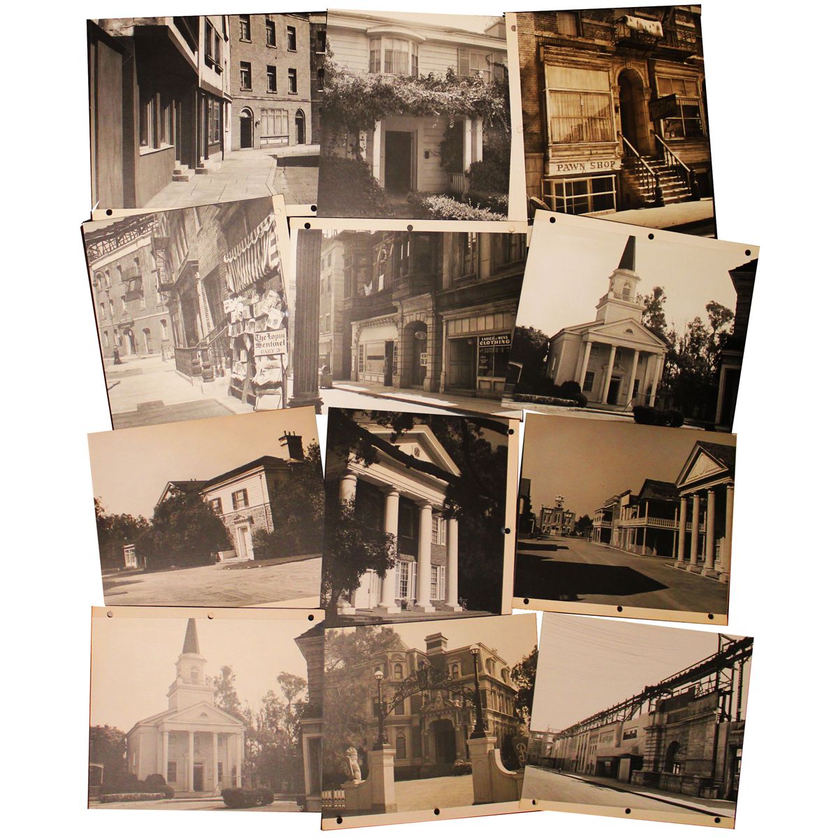 Set of 78 photos showcasing the historic back lot of film studio MGM -- Old West locales, nature settings and other unusual props such as a full-size steamboat. Photos are housed in two three-ring red binders, both titled ''Metro-Goldwyn-Mayer / Video Tape Operations / Back Lot''. Locations and buildings of the photos are generic, and were then dressed appropriately for each film or television show. Black and white photos are mounted on each side of 39 pieces of heavy cardstock measuring 8'' x 10''. Very good condition.