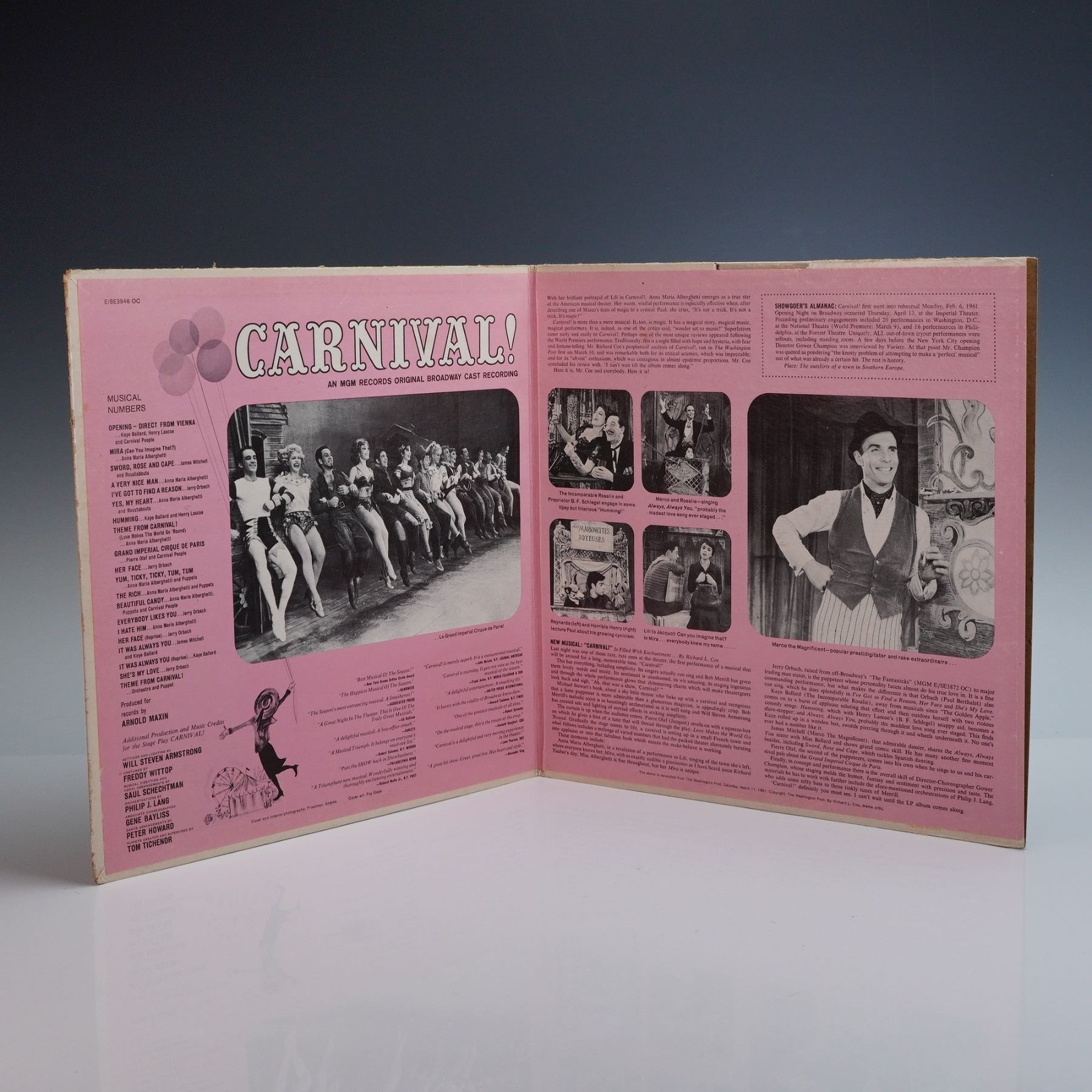 A 12-inch long-playing vinyl record issued by MGM Records, featuring the original Broadway cast recording of Carnival!! the celebrated musical adaptation of Helen Deutsch's screenplay for Lili. This high-fidelity stereo pressing includes performances by Anna Maria Alberghetti, James Mitchell, Jerry Orbach, and Kaye Ballard, with a score composed by Bob Merrill and book by Michael Stewart. The production was directed and choreographed by Gower Champion and produced by David Merrick. The record is housed in a vibrant gatefold sleeve adorned with full-color artwork, detailed liner notes, cast photography, and performance stills, encapsulating the theatrical essence and whimsical narrative of the stage production. This release captures the original cast's interpretation of a landmark 1961 musical.