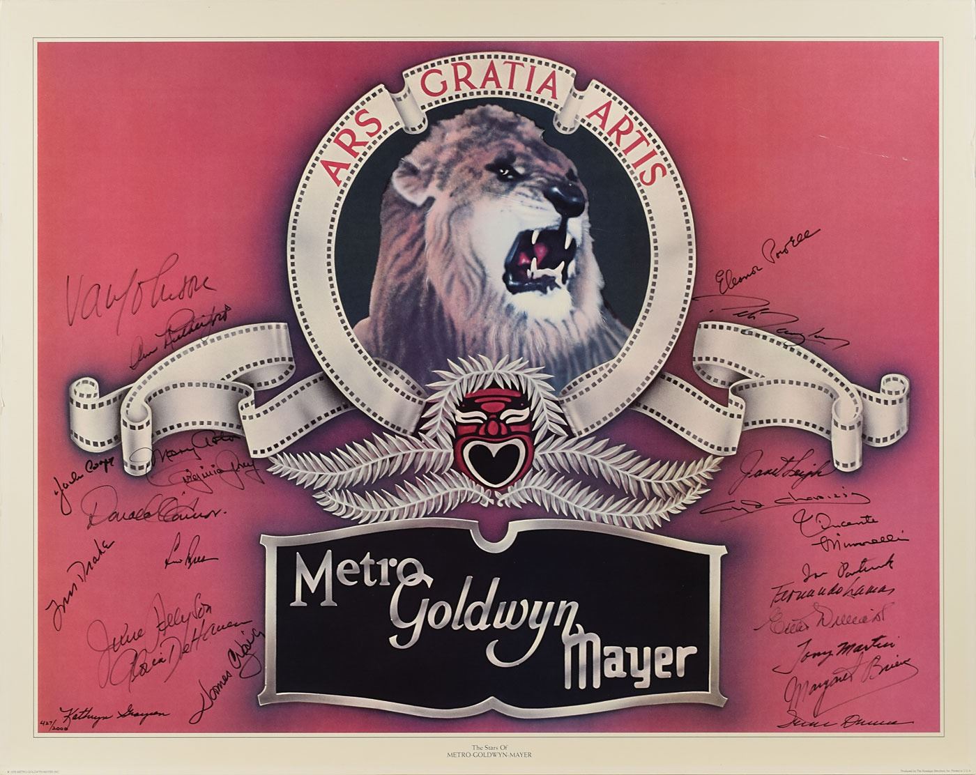 Limited edition color 30 x 24 print entitled 'The Stars of Metro–Goldwyn–Mayer,' portraying the large logo of MGM, numbered 427/2000, signed in black felt tip by twenty-two actors and actresses, including: June Allyson, Mary Astor, Lew Ayres, Cyd Charisse, James Craig, Gloria DeHaven, Tom Drake, Irene Dunne, Virginia Grey, Kathryn Grayson, Van Johnson, Fernando Lamas, Peter Lawford, Janet Leigh, Tony Martin, Vincente Minnelli, Margaret O’Brien, Donald O’Connor, Joe Pasternak, Eleanor Powell, Ann Rutherford, and Esther Williams. Affixed to a same-size foamcore mount. In fine condition, with slight fading to the image. Accompanied by its now seldom-seen original certificate of authenticity from Nostalgia Merchant.