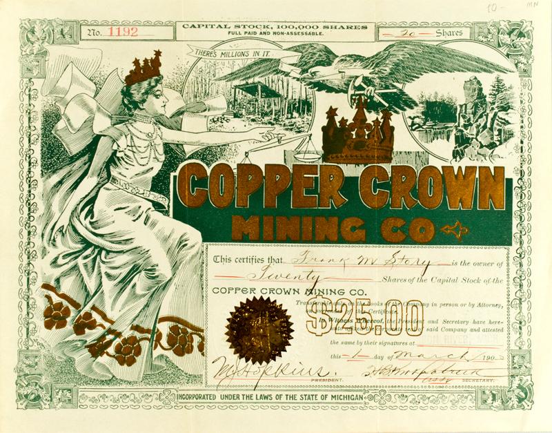 MI - March 1, 1908 - Copper Crown Mining Co. Stock :