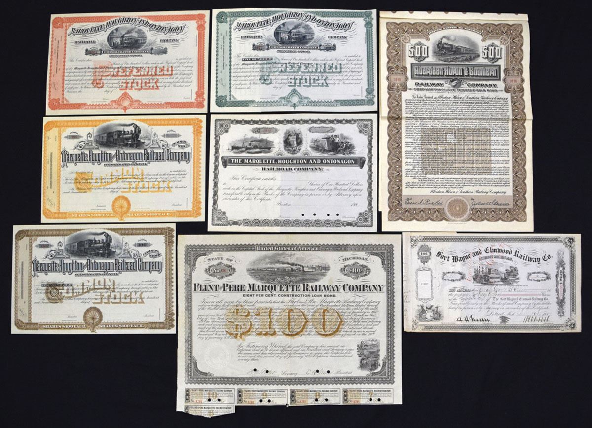 Michigan, 1873-1908. Lot of Issued, Cancelled, and U/U Remainder Stocks and Bonds, Includes:1873, Flint and Pere Marquette Railway Co., I/C Bond; 1887, Fort Wayne and Elmwood Railway Co. I/C Stock Cert; 1908, Aberdeen-Huron & Southern Railway Co., I/U Bond; Lot also includes U/U Stock Certs from Marquette, Houghton and Ontonagon Railroad Co. (5). Documents range from Fine to Unc. Condition. (8). Sold "AS IS" no returns accepted.