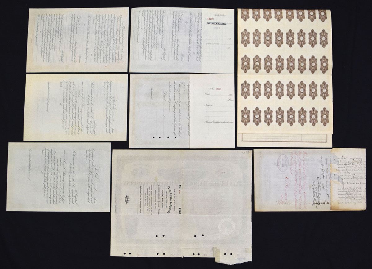 Michigan, 1873-1908. Lot of Issued, Cancelled, and U/U Remainder Stocks and Bonds, Includes:1873, Flint and Pere Marquette Railway Co., I/C Bond; 1887, Fort Wayne and Elmwood Railway Co. I/C Stock Cert; 1908, Aberdeen-Huron & Southern Railway Co., I/U Bond; Lot also includes U/U Stock Certs from Marquette, Houghton and Ontonagon Railroad Co. (5). Documents range from Fine to Unc. Condition. (8). Sold "AS IS" no returns accepted.