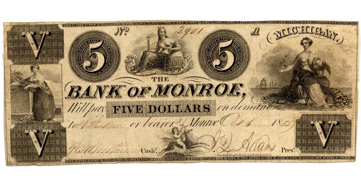 Nyholm 41 A nicer condition Bank of Monroe note with brighter paper and nice margins. A little scarcer than the lower denominations. HKA#63401