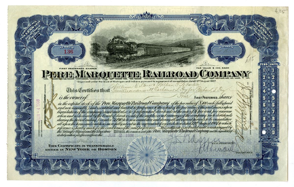 Michigan, 1908. 4 Shares First Preferred Stock I/U Certificate, Black print on blue border and underprint, Locomotive moving at top center, S/N 136, VF to XF condition with toning at right side, WBNC.