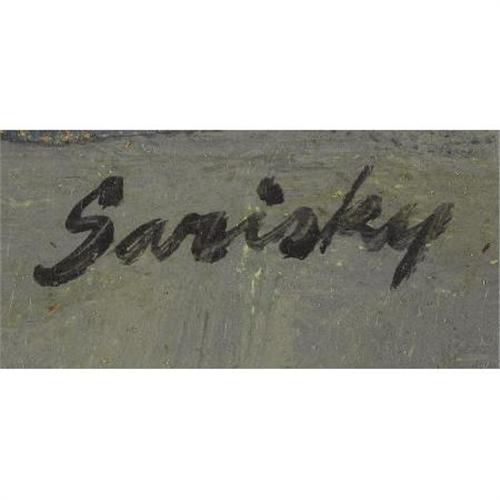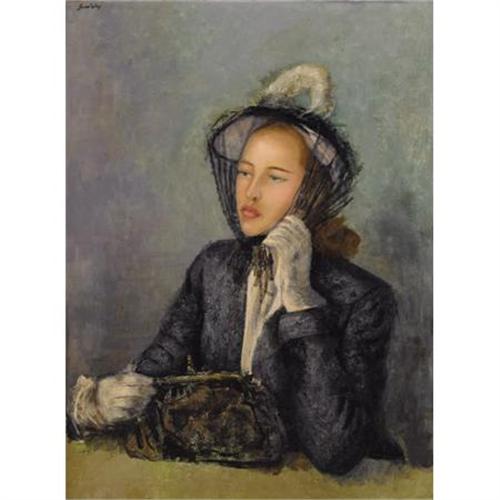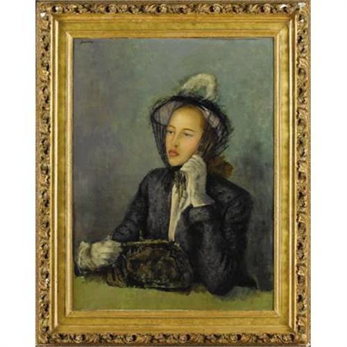 <B>MICHAEL ALOYSIUS SARISKY (American, 1906-1974)</B></I><BR><I>Portrait of Jayne</B></I><BR>Oil on board<BR>38-1/2 x 29 inches (97.8 x 73.7 cm)<BR>Signed upper left: <I>Sarisky</B></I><BR> <BR>EXHIBITED:<BR>The Cleveland Museum of Art, "32nd May Show," May 3-June 11, 1950 (label verso). <B>Condition Report:</B> Some abrasion to top edge due to frame, some losses to frame, otherwise very good condition.<BR><BR><b>Shipping:</b> Requires 3rd Party Shipping (<a target="_blank" href="http://www.heritageauctions.com/common/shipping.php">view shipping information</a>)