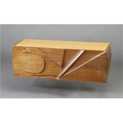 MICHAEL COFFEY has been a presence in American studio furniture since the early 1970s when he established his school of fine woodworking in New England. He has since executed hundreds of major commissions, exhibited widely and taught two generations of craftsmen. Today, he continues a tradition of innovative work in his Massachusetts studio. The following two lots are from the collection of the artist. Fine and rare MICHAEL COFFEY white oak and Mozambique wood wall-mounted desk, "Variations," with sculpted drop-front and sides, interior gallery, and dovetailed corners. Carved M. Coffey. 14 1/2" x 42" x 15 1/2" $4,000 - 6,000