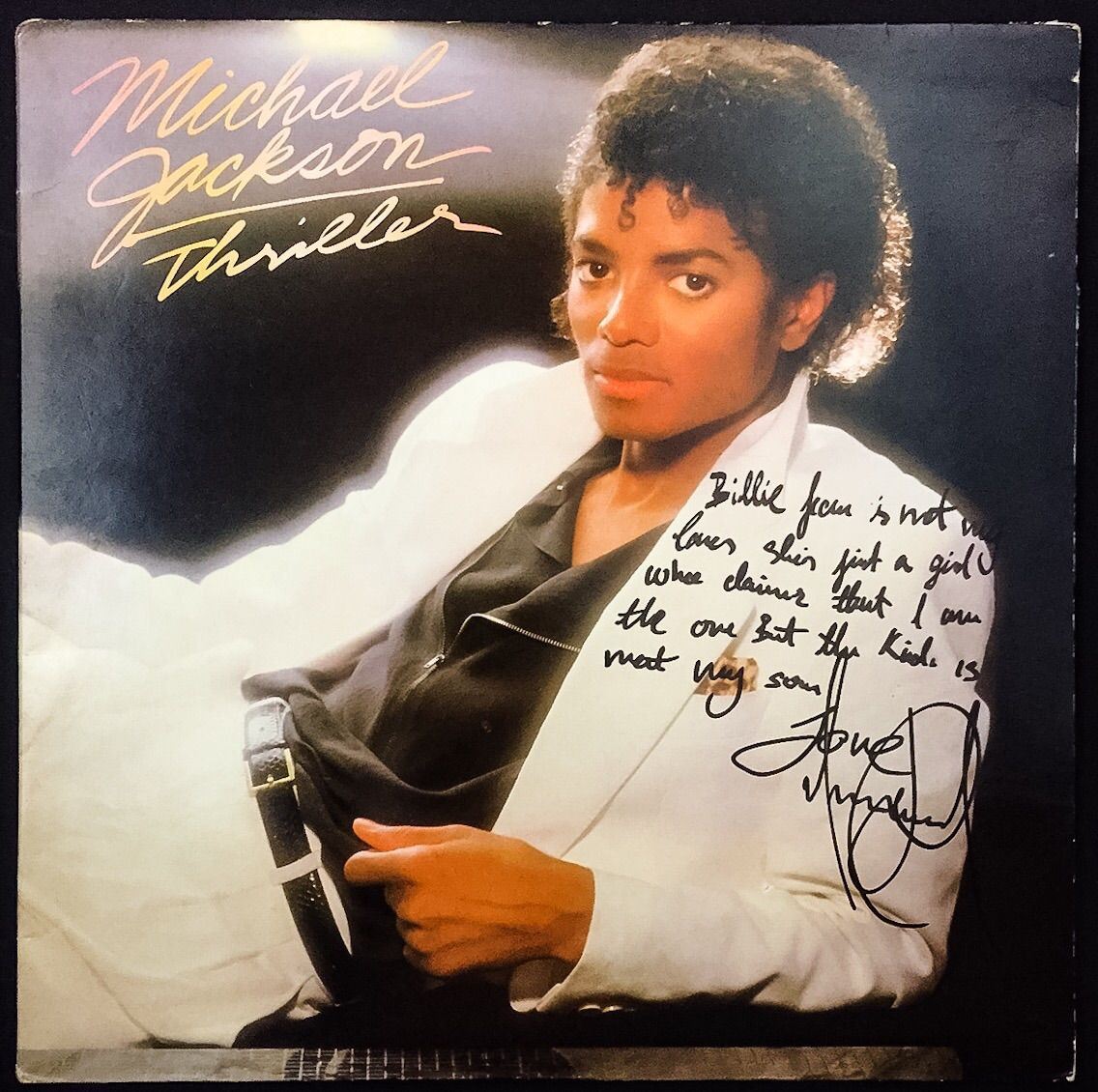A THRLLER ALBUM WITH PART OF THE LYRICS TO BILLIE JEAN INSCRIBED AND SIGNED BY MICHAEL JACKSON IN BLACK MARKER. ORIGINALLY PART OF A GOTTA HAVE IT AUCTION.