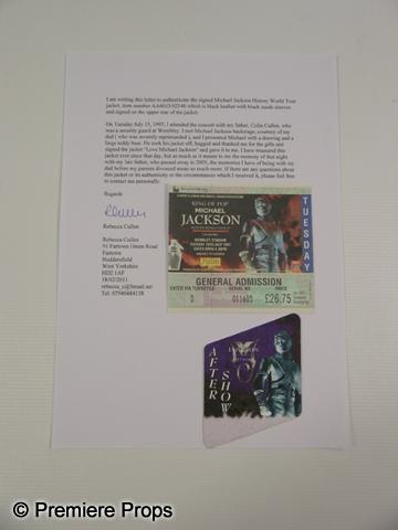 Michael Jackson Signed History World Tour Jacket -  Michael Jackson personally owned and worn promotional jacket from the “History World Tour”.  Michael Jackson was wearing the jacket backstage after his concert in Wembley Stadium, England on July 15, 1997.  Backstage, the daughter of one of his security guards presented him with a drawing and a teddy bear.  He hugged and thanked her and took off his jacket, autographed it “Love Michael Jackson” and gave it to her as a gift.  Includes original History World Tour 97’ concert ticket dated July 15, 1997 and “After Show” backstage pass.  Accompanied by letter of provenance from original owner.