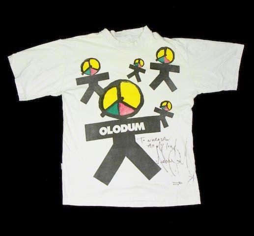 White cotton with Olodum graphic t shirt, signed by Michael in black marker and inscribed To Norman All my love, labelled Olodum Bahia-Brasil;Provenance: Bonhams lot 360. 3 Jul 2012. Knightsbridge, London. England.