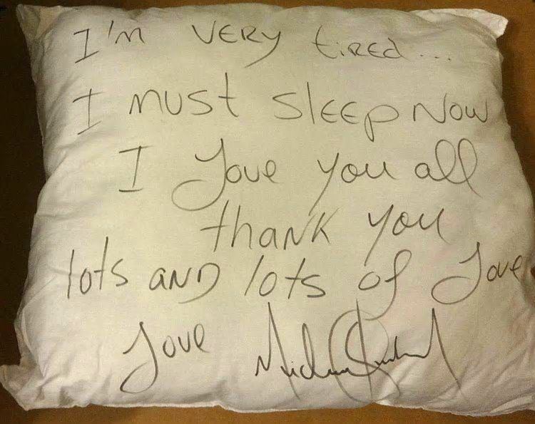 MICHAEL JACKSON SIGNED PILLOW A large thick pillow within a white pillowcase. It's been boldly signed with a black felt tip pen 'I'm very tired... I must sleep now I love you all thank you lots and lots of love love Michael Jackson. The message covers the entire surface of the pillow. Dimensions: 22 inches x 19 inches.