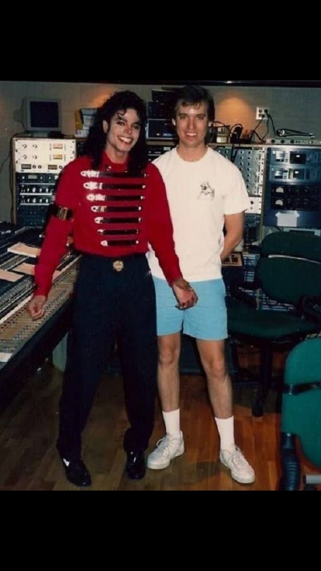 A PAIR OF MICHAEL JACKSONS PERSONAL CUSTOMIZED PANTS. THE PANTS HAVE A DENNIS TOMPKINS AND MICHAEL BUSH LABEL ON THE INSIDE. THE PHOTO SHOWS MICHAEL JACKSON WEARING A SIMILAR STYLE OF PANTS.