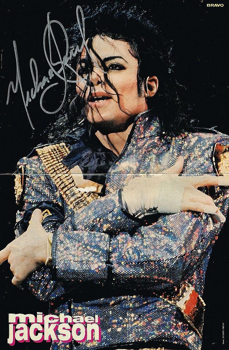 A poster of Michael Jackson performing 'Jam' during his Dangerous tour in 1992/1993, signed by Michael Jackson in Silver pen.