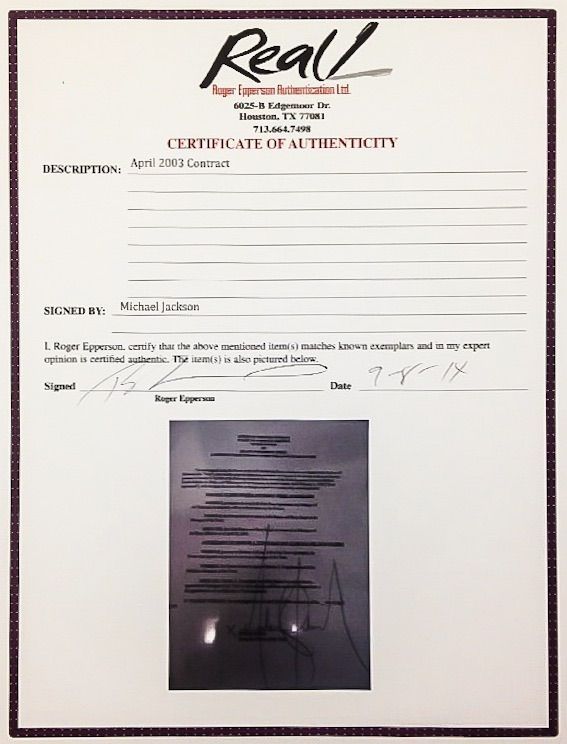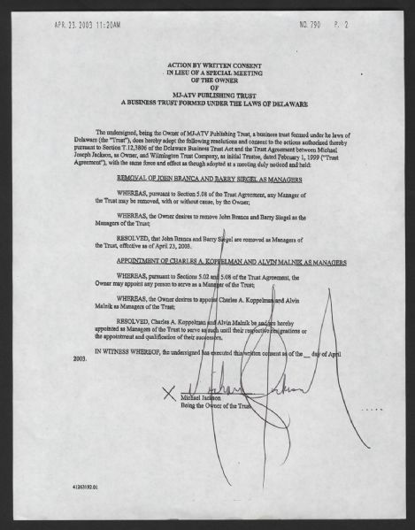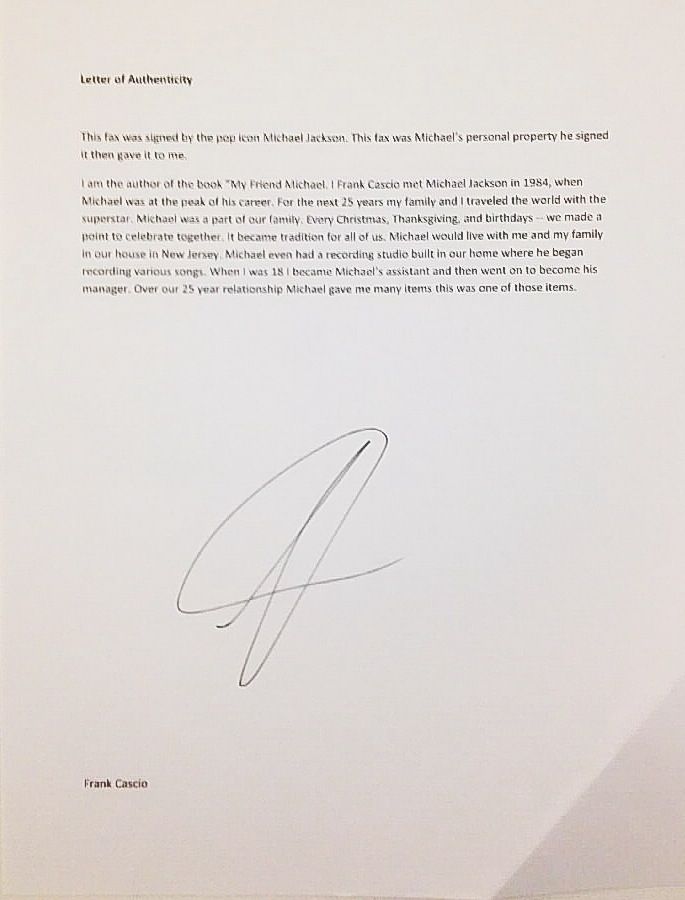 A MICHAEL JACKSON SIGNED FAX PAGE DETAILING THE REMOVAL AND APPOINTMENT OF MANAGERS. INCLUDES A CERTIFICATE OF AUTHENTICITY FROM REAL/ROGER EPPERSON. ADITIONALLY INCLUDES A LETER FROM MICHAEL JACKSONS FRIEND AND ASSISTANT FRANK CASCIO. MEASURING 8 1/2 X 11 INCHES.