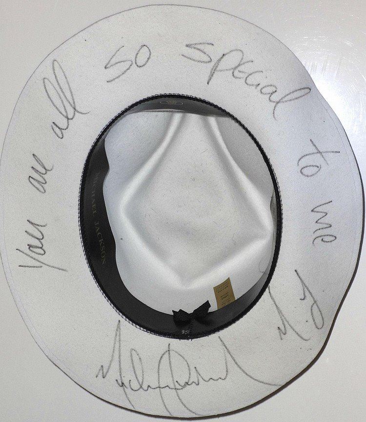 A Shannon Phillips collection white fedora with gold tag wpl 5923 made in the USA with Michael Jackson eched in gold colour signed and inscibed by Michael Jackson on the inner brim in black sharpie 'You are all so special to me' with initals 'MJ' 'and signed 'Michael Jackson'. Condition: Very good. Supplied with coa.